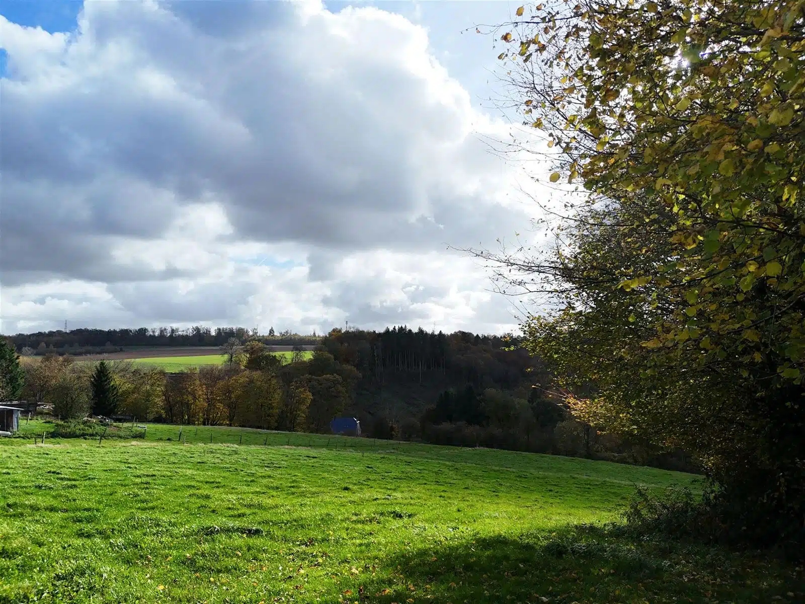 OPTION Terrain partiellement en zone d'habitat à l’état de prairie, de relief en pente sud sis à deux voiries asphaltées dans un très bel environnement, à côté du village de Celles.