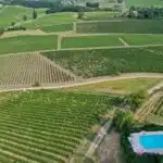 Environnée de vignobles vallonnés, accessible par une petite route sinueuse située au sommet d’une colline habitée aux 3 000 ans d’histoire, la propriété constitue un grand domaine viticole familial. Elle se compose d’une maison de maître bâtie au milieu du 19e s. et de bâtiments d’exploitation avec lesquels elle forme une cour : un chai pour la vinification des blancs et des rosés, un chai pour les vins rouges et un bâtiment qui abrite une salle de dégustation, une réception et des bureaux. En contrebas, un hangar agricole sert à la maintenance du matériel tandis que, sur le versant opposé, un bâtiment construit récemment permet le conditionnement, le stockage et l’expédition des bouteilles.