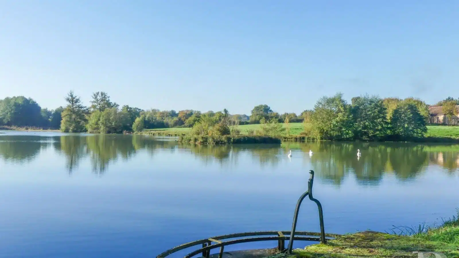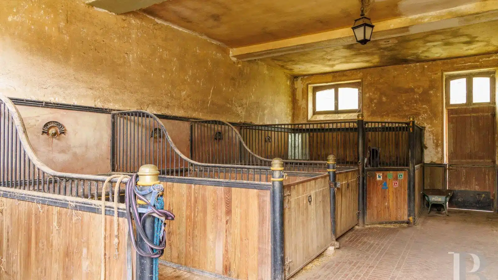 Après avoir dépassé plusieurs villages typiques de la région, une petite route de campagne dessert les deux entrées de la propriété : la première est matérialisée par un petit portail animé d'une ancienne conciergerie, tandis que la seconde, beaucoup plus imposante, est marquée par deux grands doubles portails en fer forgé à hérisson soutenus par quatre piliers mêlant la brique et la pierre ; des chasse-roues d'origine s'alignent au muret en briquettes qui soutient la clôture ouvragée. Ce dernier accès fait face à un étang magistral par la beauté de ses rives et de ses cygnes, symbole chevaleresque et romanesque s'il en est. Un peu plus loin, un petit chemin accède à un troisième portail en ferronnerie dévoilant un chemin qui grimpe vers la propriété. De grands chênes bordent une allée qui lentement dépasse des dépendances, puis des prés où vont et viennent des chevaux. Une grande cour semi-circulaire où cohabitent orangers, palmiers et vases Médicis fait face au château, en surplomb du parc. Un escalier placé dans l'axe de l'édifice conduit à l'ancien verger, agrémenté d'une fontaine authentique en pierre qu'ornent deux angelots. Enfin, cachée dans la verdure, apparaît la maison du gardien, à proximité d'une cour fermée entourée de dépendances, au centre de laquelle se tient un ancien pédiluve en brique pour les chevaux.