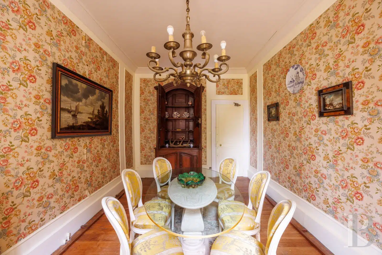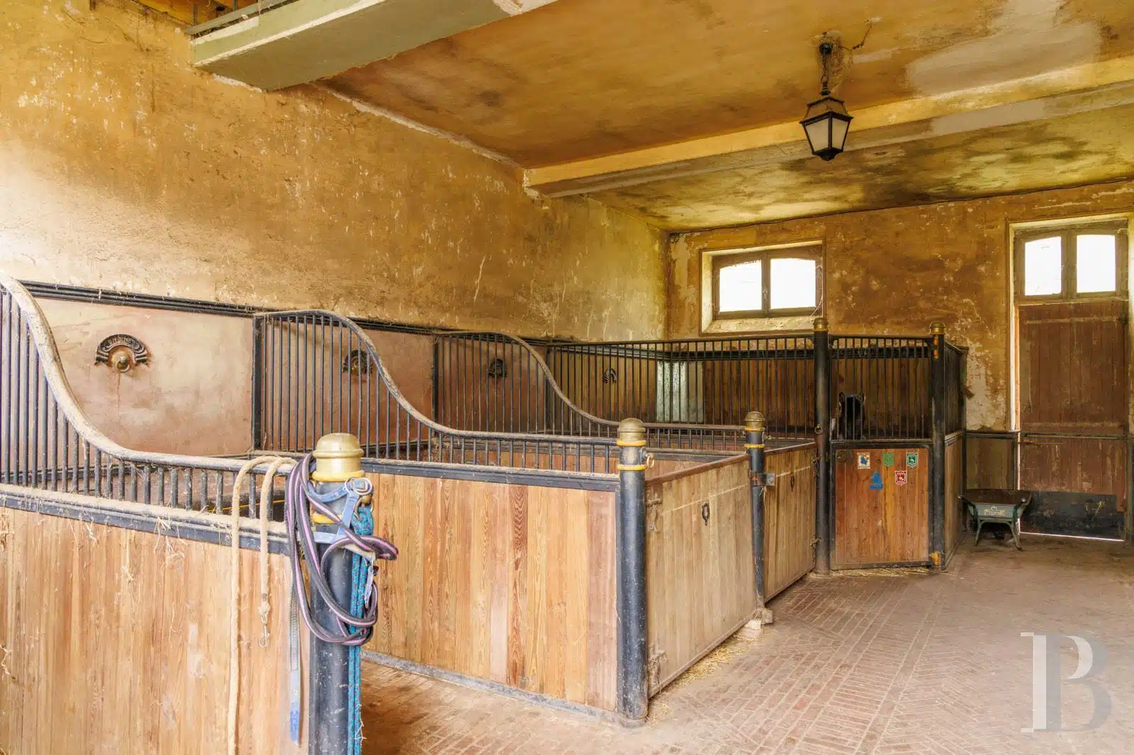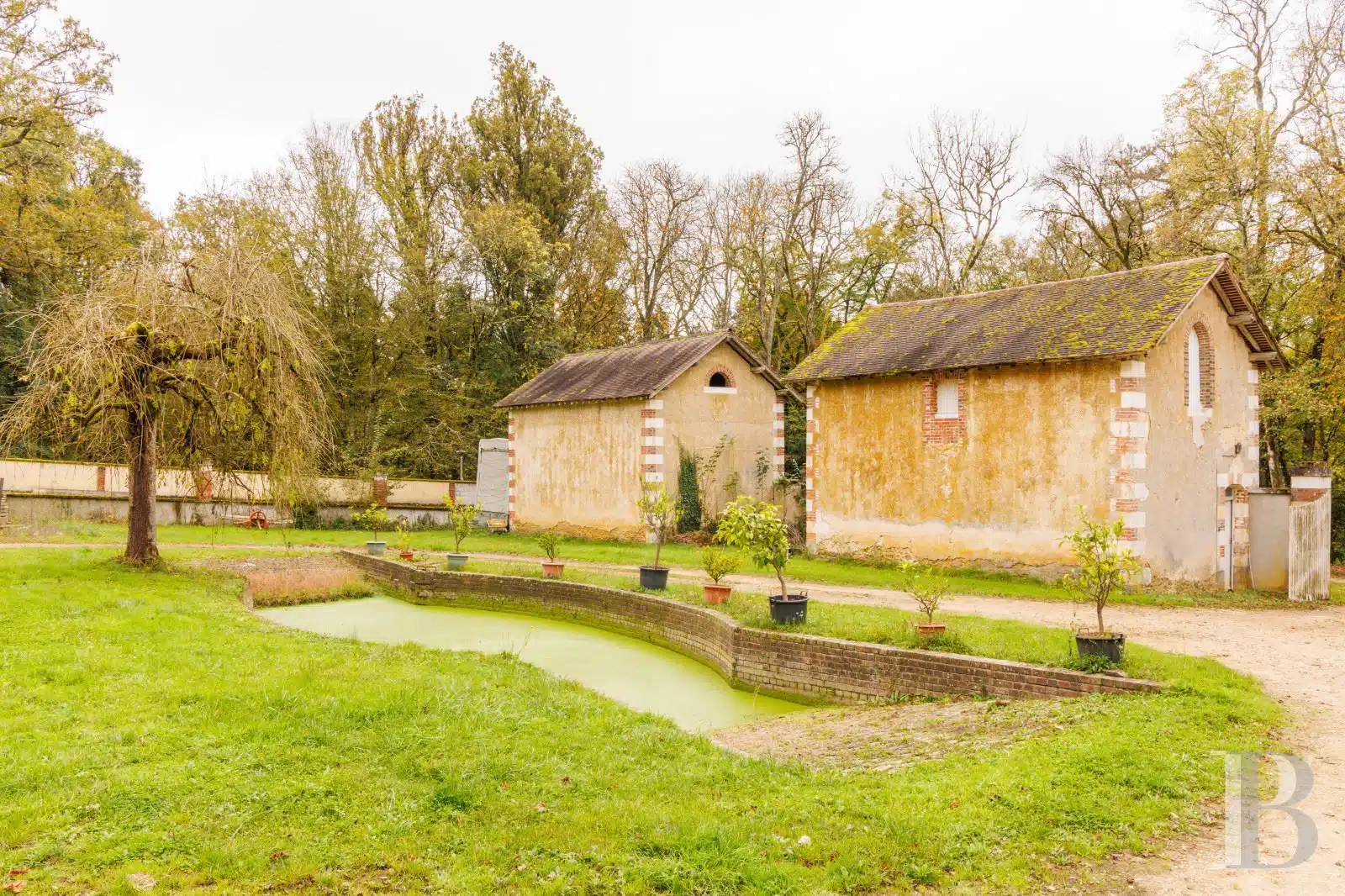 Après avoir dépassé plusieurs villages typiques de la région, une petite route de campagne dessert les deux entrées de la propriété : la première est matérialisée par un petit portail animé d'une ancienne conciergerie, tandis que la seconde, beaucoup plus imposante, est marquée par deux grands doubles portails en fer forgé à hérisson soutenus par quatre piliers mêlant la brique et la pierre ; des chasse-roues d'origine s'alignent au muret en briquettes qui soutient la clôture ouvragée. Ce dernier accès fait face à un étang magistral par la beauté de ses rives et de ses cygnes, symbole chevaleresque et romanesque s'il en est. Un peu plus loin, un petit chemin accède à un troisième portail en ferronnerie dévoilant un chemin qui grimpe vers la propriété. De grands chênes bordent une allée qui lentement dépasse des dépendances, puis des prés où vont et viennent des chevaux. Une grande cour semi-circulaire où cohabitent orangers, palmiers et vases Médicis fait face au château, en surplomb du parc. Un escalier placé dans l'axe de l'édifice conduit à l'ancien verger, agrémenté d'une fontaine authentique en pierre qu'ornent deux angelots. Enfin, cachée dans la verdure, apparaît la maison du gardien, à proximité d'une cour fermée entourée de dépendances, au centre de laquelle se tient un ancien pédiluve en brique pour les chevaux.
