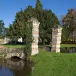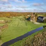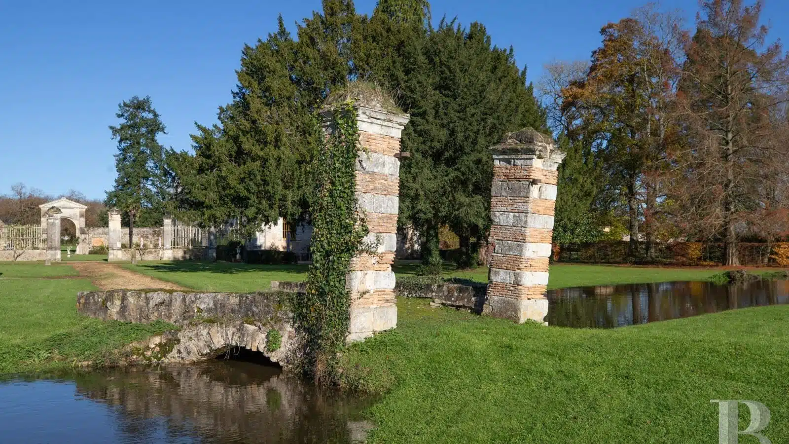 Un jardin en topiaire se déploie devant l'autre façade du château, à l'est. S'y trouvent aussi un pigeonnier, un verger, un potager, des arbres d'ornement et un cours d'eau. Un pont ancien flanqué des colonnes d'un ancien porche l'enjambe. Alentour, le parc est composé de prairies, de grands arbres et d'un petit bois. Des installations équestres sont aménagées à l'ouest de la dépendance, côté parc. Elles comprennent des paddocks en bois, un manège, un espace de repos.