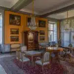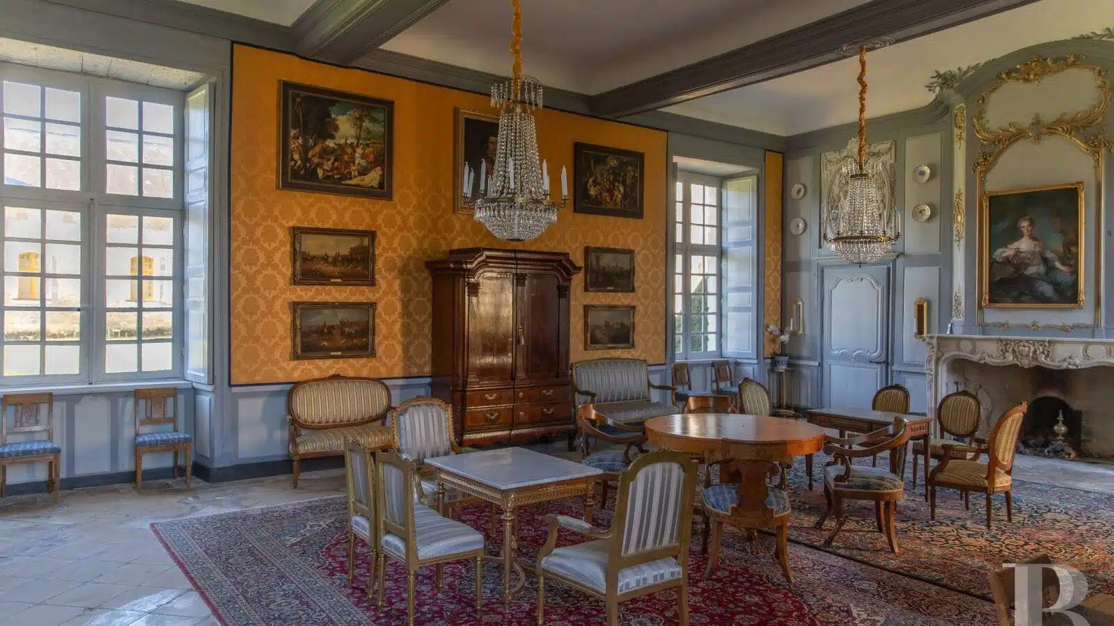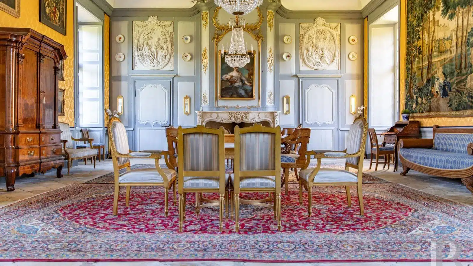 Les intérieurs ont conservé leurs décors d'origine : cartouches, médaillons, trumeaux, encadrements, boiseries, marbre, pierre. La taille des pièces nobles, leur hauteur sous plafond, rendent l'ensemble remarquable.