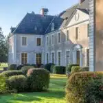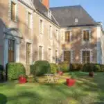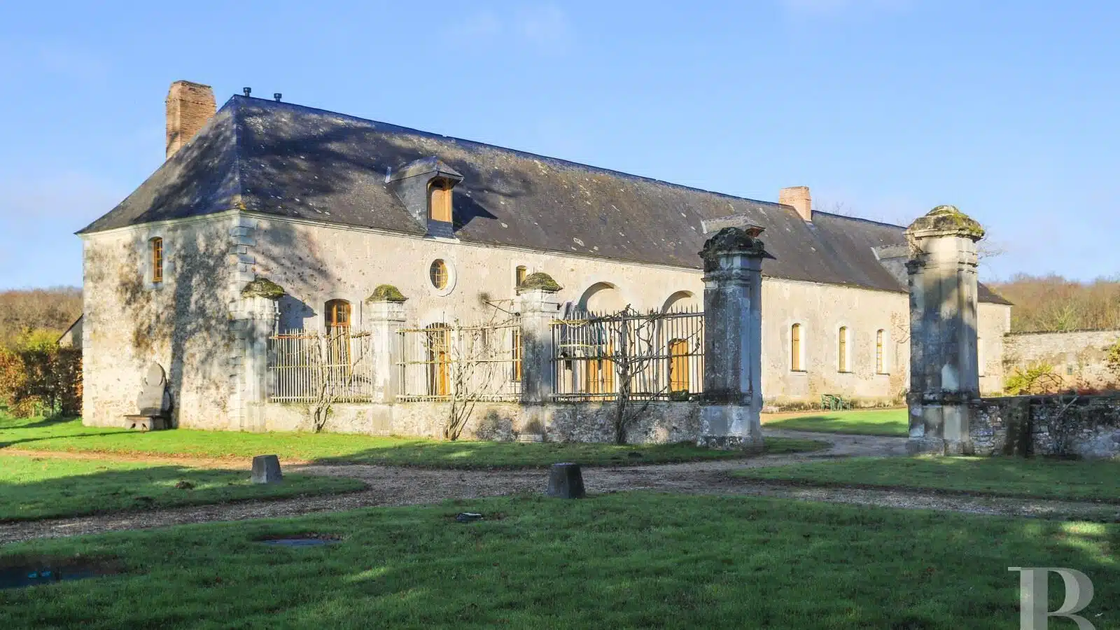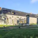 Deux allées mènent à un porche à fronton qui ouvre sur une cour d'honneur. Le château s'élève d'un côté et un vaste bâtiment de dépendances de l'autre. Un puits couvert est percé au centre. Les deux façades sont ponctuées d'ifs taillés. L'actuel château correspond au logis abbatial : c'est là que résidait le Père Abbé, dans l'aile ouest de l'ancienne abbaye. Au cours du 18e s., la cour est à Versailles et les bâtiments furent décorés et aménagés pour être loués et procurer ainsi un revenu à l'abbaye. Élevé de trois niveaux, dont un sous combles, l'édifice est en pierre et moellon enduit. Sa toiture d'ardoise à quatre pans est percée de quatre ils-de-buf côté parc et de trois lucarnes attiques dans le fronton côté cour, ainsi que de quatre autres lucarnes. Les deux façades est et ouest sont à fronton, doublées au surplomb des portes d'entrée centrales. Les encadrements des baies sont à bossage en pierre. Les trois portes sont surmontées de frontons curvilignes ou triangulaires. Les chaînes d'angle, la corniche et les lucarnes sont en pierre calcaire.