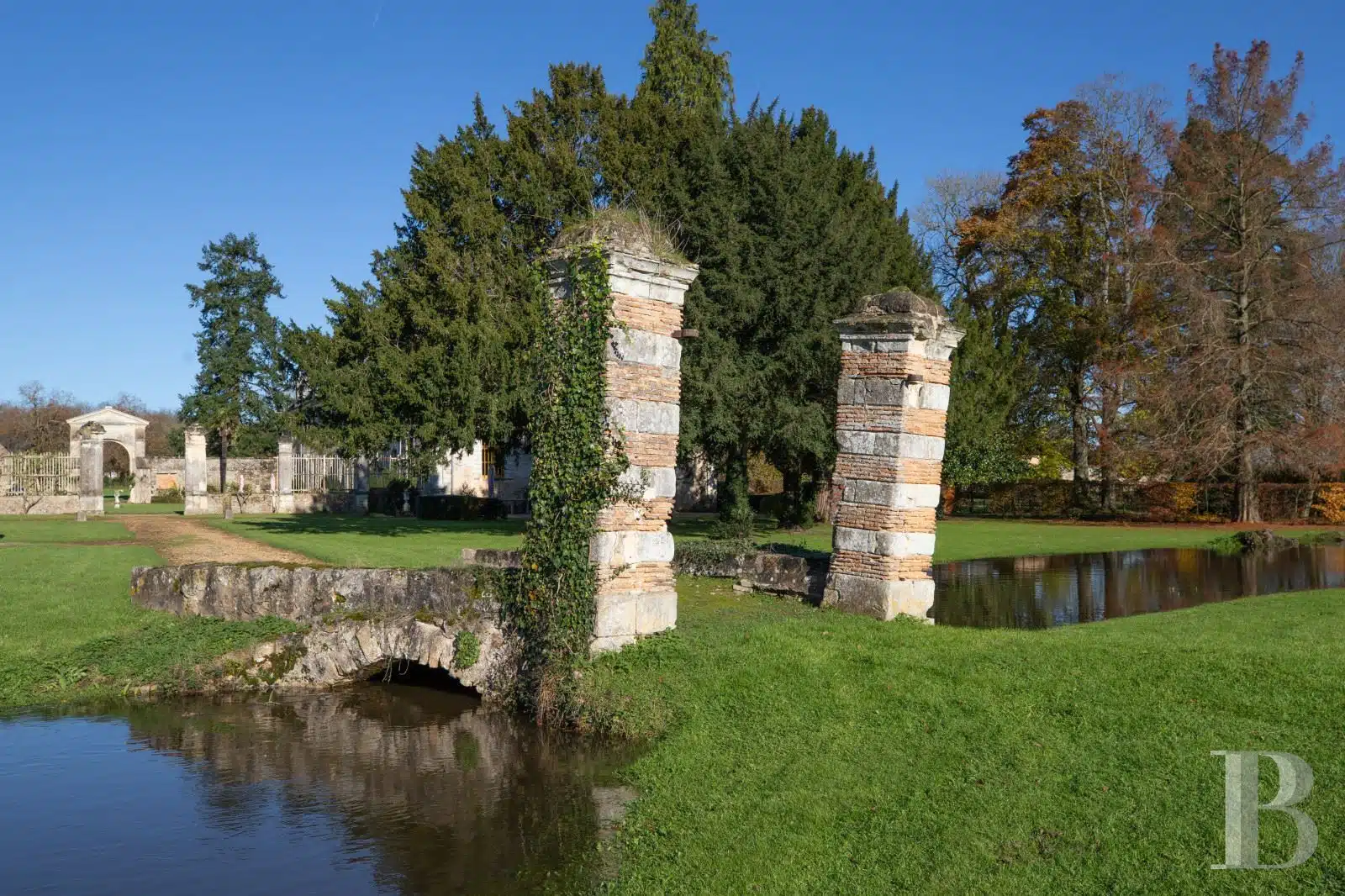 Un jardin en topiaire se déploie devant l'autre façade du château, à l'est. S'y trouvent aussi un pigeonnier, un verger, un potager, des arbres d'ornement et un cours d'eau. Un pont ancien flanqué des colonnes d'un ancien porche l'enjambe. Alentour, le parc est composé de prairies, de grands arbres et d'un petit bois. Des installations équestres sont aménagées à l'ouest de la dépendance, côté parc. Elles comprennent des paddocks en bois, un manège, un espace de repos.