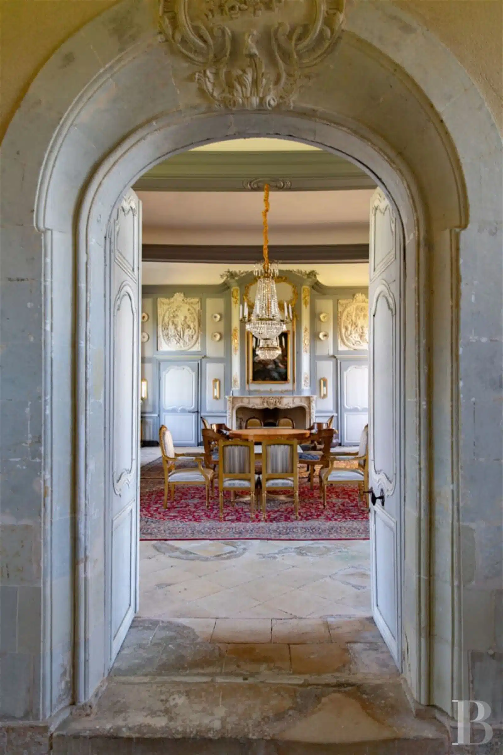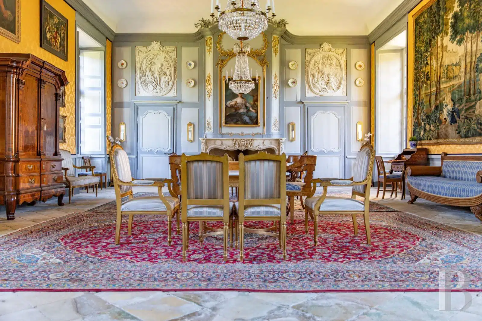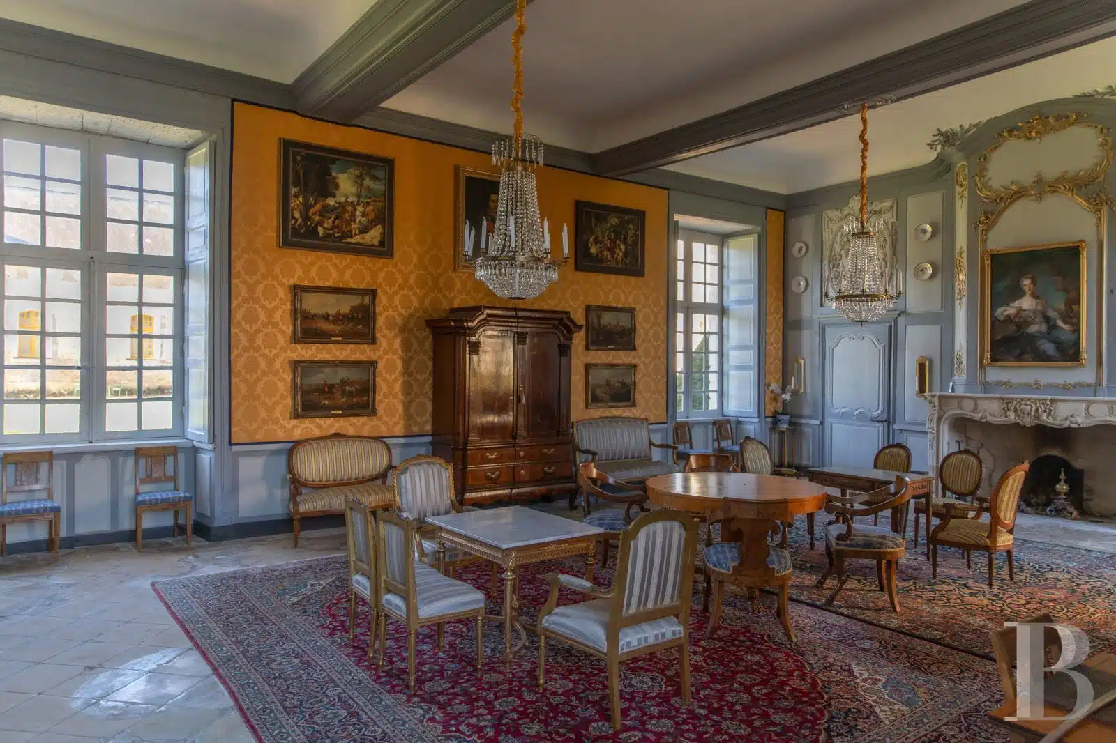 Les intérieurs ont conservé leurs décors d'origine : cartouches, médaillons, trumeaux, encadrements, boiseries, marbre, pierre. La taille des pièces nobles, leur hauteur sous plafond, rendent l'ensemble remarquable.