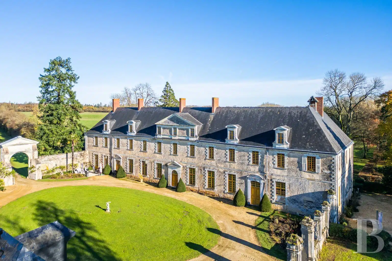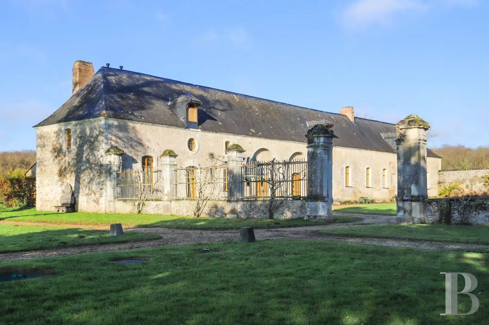 Deux allées mènent à un porche à fronton qui ouvre sur une cour d'honneur. Le château s'élève d'un côté et un vaste bâtiment de dépendances de l'autre. Un puits couvert est percé au centre. Les deux façades sont ponctuées d'ifs taillés. L'actuel château correspond au logis abbatial : c'est là que résidait le Père Abbé, dans l'aile ouest de l'ancienne abbaye. Au cours du 18e s., la cour est à Versailles et les bâtiments furent décorés et aménagés pour être loués et procurer ainsi un revenu à l'abbaye. Élevé de trois niveaux, dont un sous combles, l'édifice est en pierre et moellon enduit. Sa toiture d'ardoise à quatre pans est percée de quatre ils-de-buf côté parc et de trois lucarnes attiques dans le fronton côté cour, ainsi que de quatre autres lucarnes. Les deux façades est et ouest sont à fronton, doublées au surplomb des portes d'entrée centrales. Les encadrements des baies sont à bossage en pierre. Les trois portes sont surmontées de frontons curvilignes ou triangulaires. Les chaînes d'angle, la corniche et les lucarnes sont en pierre calcaire.