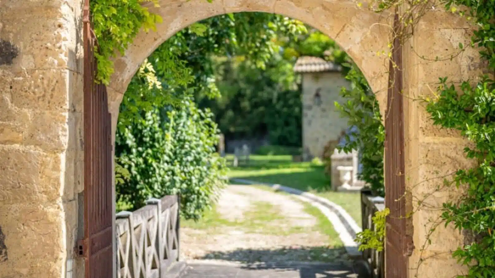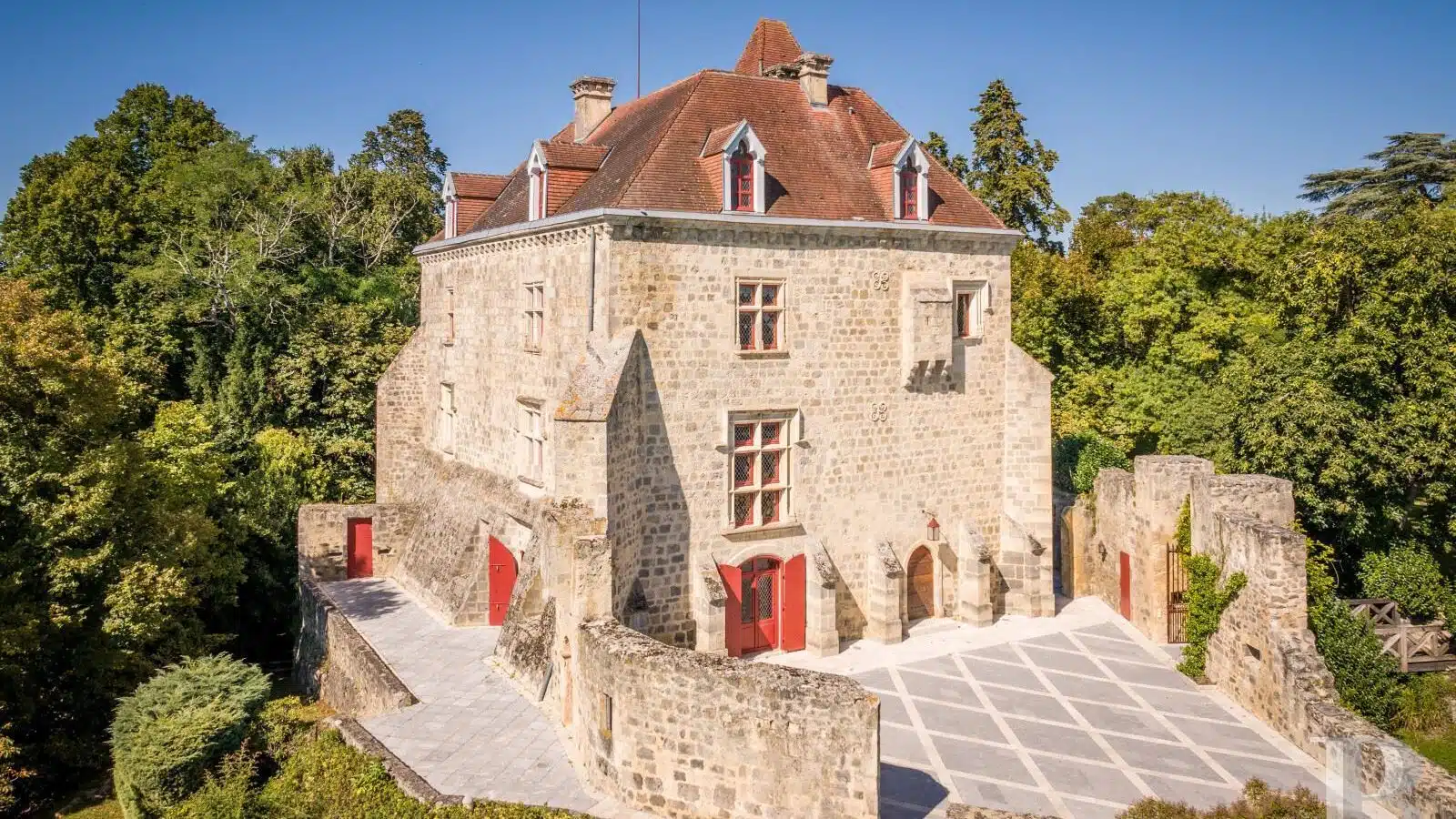 Une étroite route communale permet d'accéder aux deux entrées de la propriété, totalement protégée des regards par des haies fournies. Passé un portail en fer forgé encadré de piliers en pierre, une allée cavalière s'enfonce sous la frondaison d'arbres majestueux plusieurs fois centenaires. De grandes pelouses se déploient jusqu'au terrain de tennis et ses abords paysagers. Après plus de 200 m, une première grande bâtisse, "la maison d'amis", composée de deux corps à l'équerre et dont l'allure rappelle celle des chaumières, se dévoile. Sur la droite apparaît alors le château. Elevé sur quatre niveaux, coiffé de pavillons couverts de tuile plate, il est entouré d'une terrasse dallée de pierre et ceinturé de murs et de douves sèches qu'enjambe l'ancien pont-levis. Il se présente telle la proue d'un navire dominant la campagne vallonnée au sud, offrant une vue jusqu'aux Pyrénées.