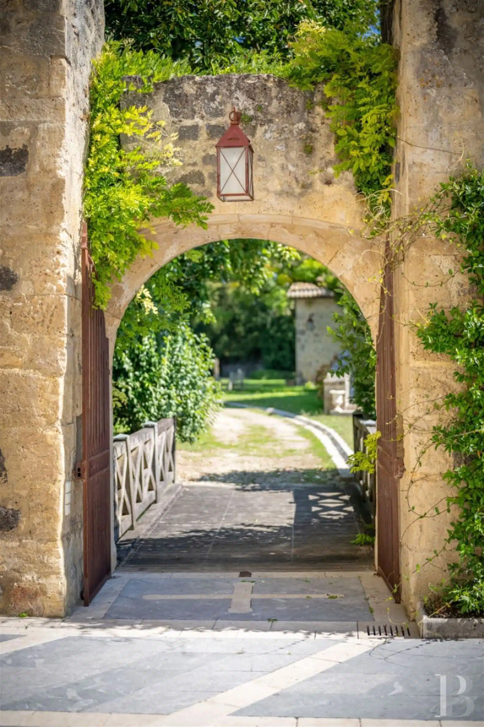 Une étroite route communale permet d'accéder aux deux entrées de la propriété, totalement protégée des regards par des haies fournies. Passé un portail en fer forgé encadré de piliers en pierre, une allée cavalière s'enfonce sous la frondaison d'arbres majestueux plusieurs fois centenaires. De grandes pelouses se déploient jusqu'au terrain de tennis et ses abords paysagers. Après plus de 200 m, une première grande bâtisse, "la maison d'amis", composée de deux corps à l'équerre et dont l'allure rappelle celle des chaumières, se dévoile. Sur la droite apparaît alors le château. Elevé sur quatre niveaux, coiffé de pavillons couverts de tuile plate, il est entouré d'une terrasse dallée de pierre et ceinturé de murs et de douves sèches qu'enjambe l'ancien pont-levis. Il se présente telle la proue d'un navire dominant la campagne vallonnée au sud, offrant une vue jusqu'aux Pyrénées.
