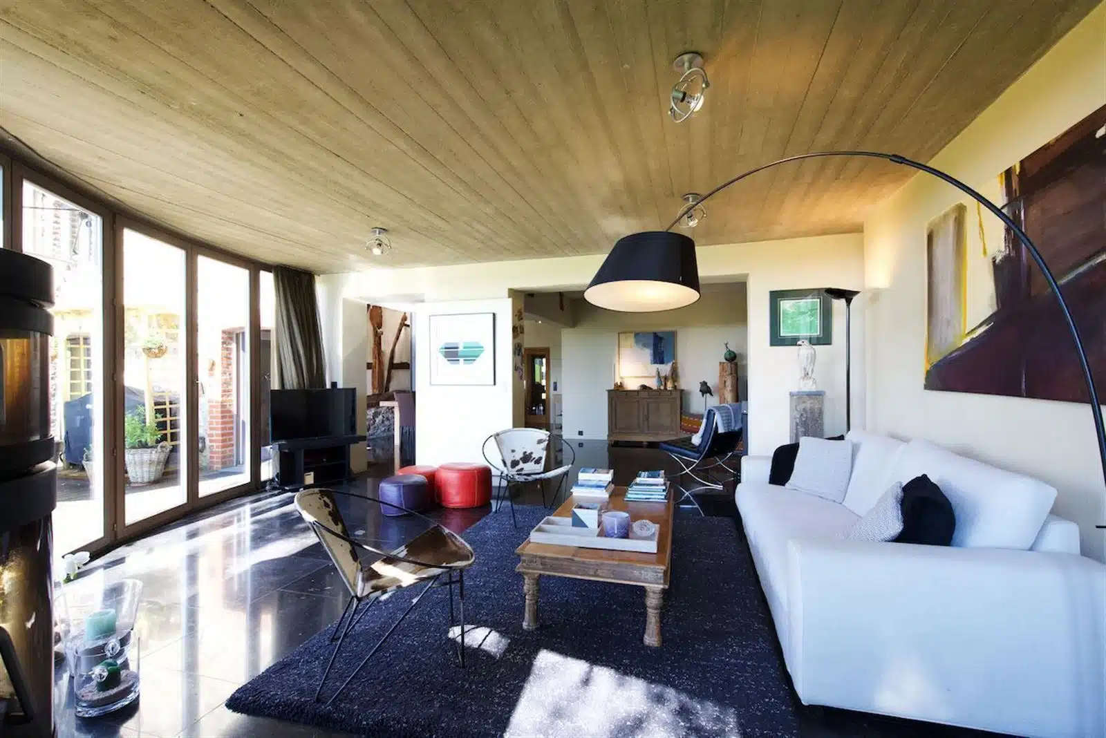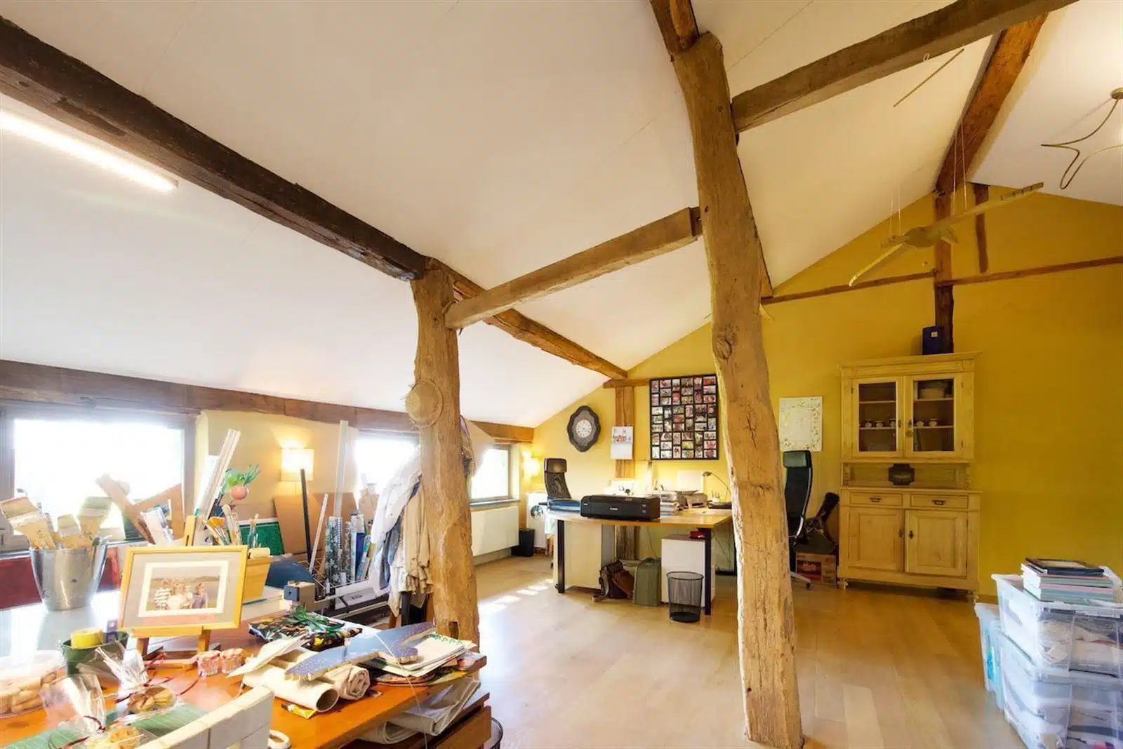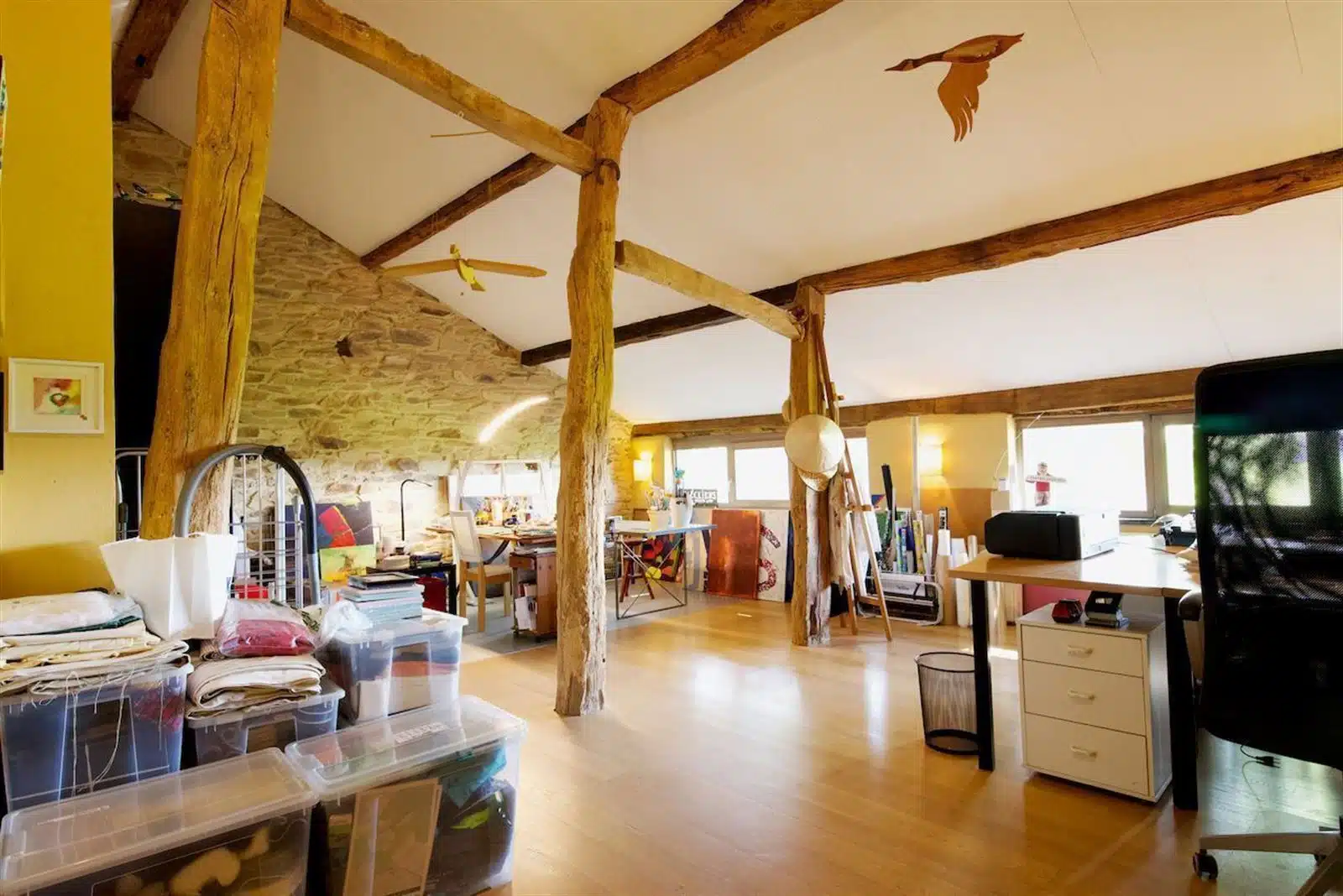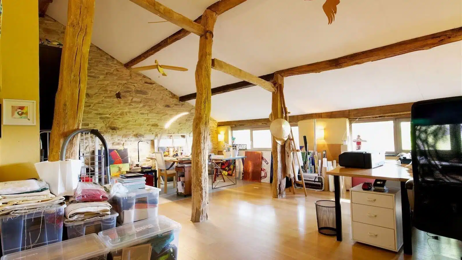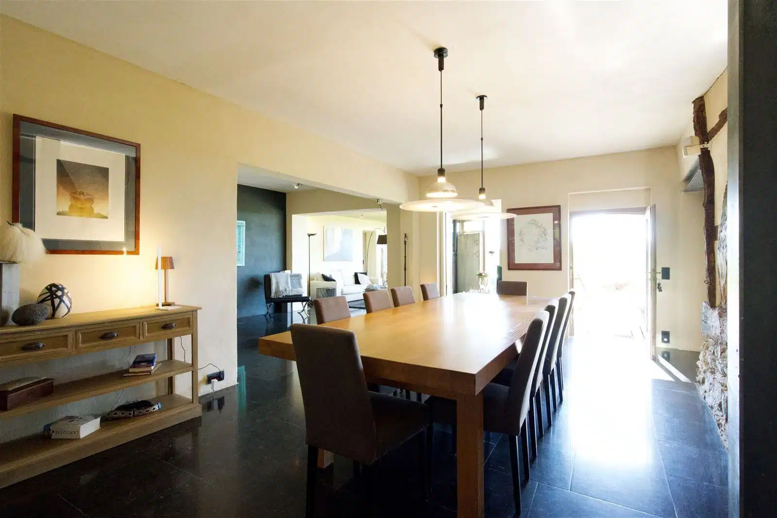 L’habitation comprend de très agréables pièces de vie : grand et lumineux salon, salle à manger, cuisine équipée, petit salon, sauna, 5 chambres dont une avec sauna, 5 salles de bains et également un vaste bureau et un grand atelier/ pièce polyvalente.