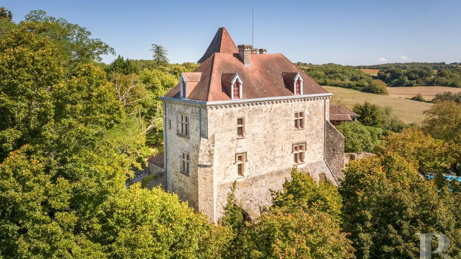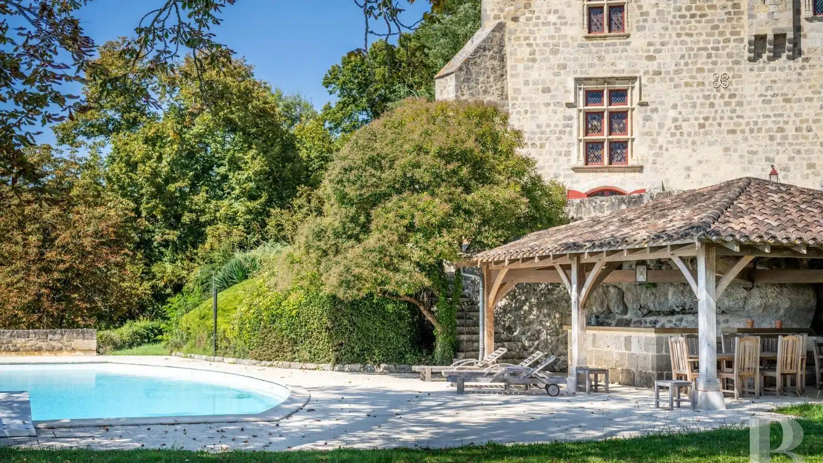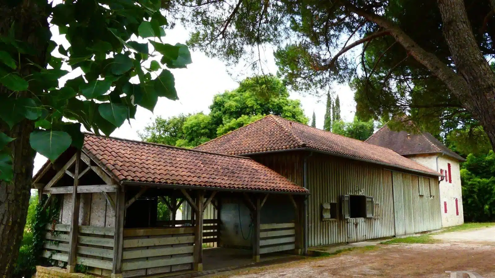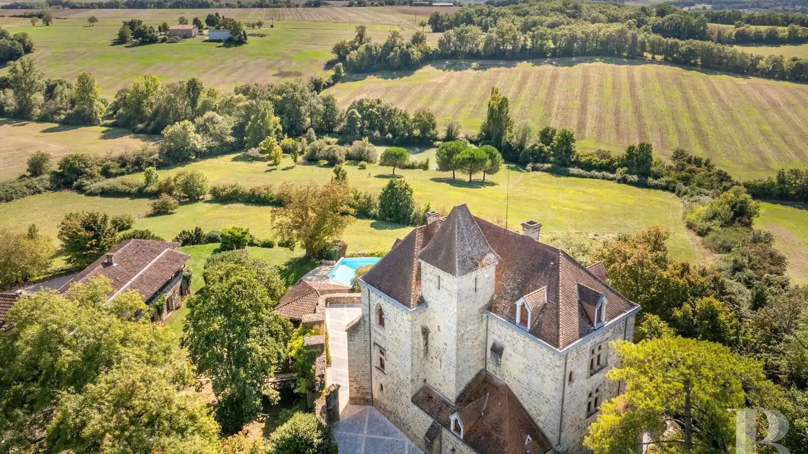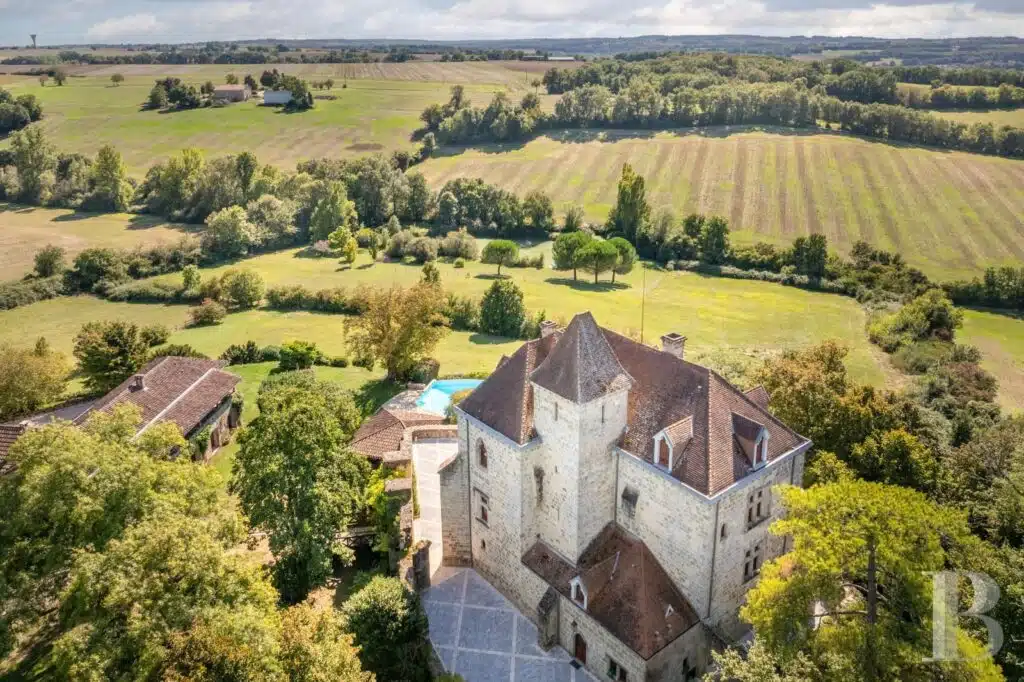 Une paisible route communale permet d'accéder aux deux entrées de la propriété, totalement protégée des regards par des haies fournies. Passé un portail en fer forgé encadré de piliers en pierre, une allée cavalière s'enfonce sous la frondaison d'arbres majestueux plusieurs fois centenaires. De grandes pelouses se déploient jusqu'au terrain de tennis et ses abords paysagers. Après plus de 200 m, une première grande bâtisse, à usage de maison d'amis, composée de deux corps à l'équerre et dont l'allure rappelle celle des chaumières, se dévoile. Sur la droite apparaît alors le château. Élevé de quatre niveaux, coiffé de pavillons couverts de tuiles plates, il est entouré d'une terrasse dallée de pierre et ceinturé de murs ainsi que de douves sèches qu'enjambe l'ancien pont-levis. Il se présente telle la proue d'un navire dominant la campagne vallonnée au sud, offrant une vue jusqu'aux Pyrénées. À une soixantaine de mètres de la première dépendance, une seconde, de type longère, entourée de prés clos, abrite un logement et des écuries. Un hangar à vocation agricole, fermé sur trois pans, complète l'ensemble bâti. Desservie par un chemin d'accès privé qui conduit à la route, cette partie du domaine est séparée des habitations principales par un épais massif végétal. En contrebas du château, à flanc de coteau, une piscine à débordement prend place au sein d'une grande terrasse dallée, agrémentée d'une étonnante cuisine d'été abritée et bâtie contre la roche en sortie de douve. Les terres du domaine s'étendent jusqu'au lac créé en bas du vallon et sur les coteaux.