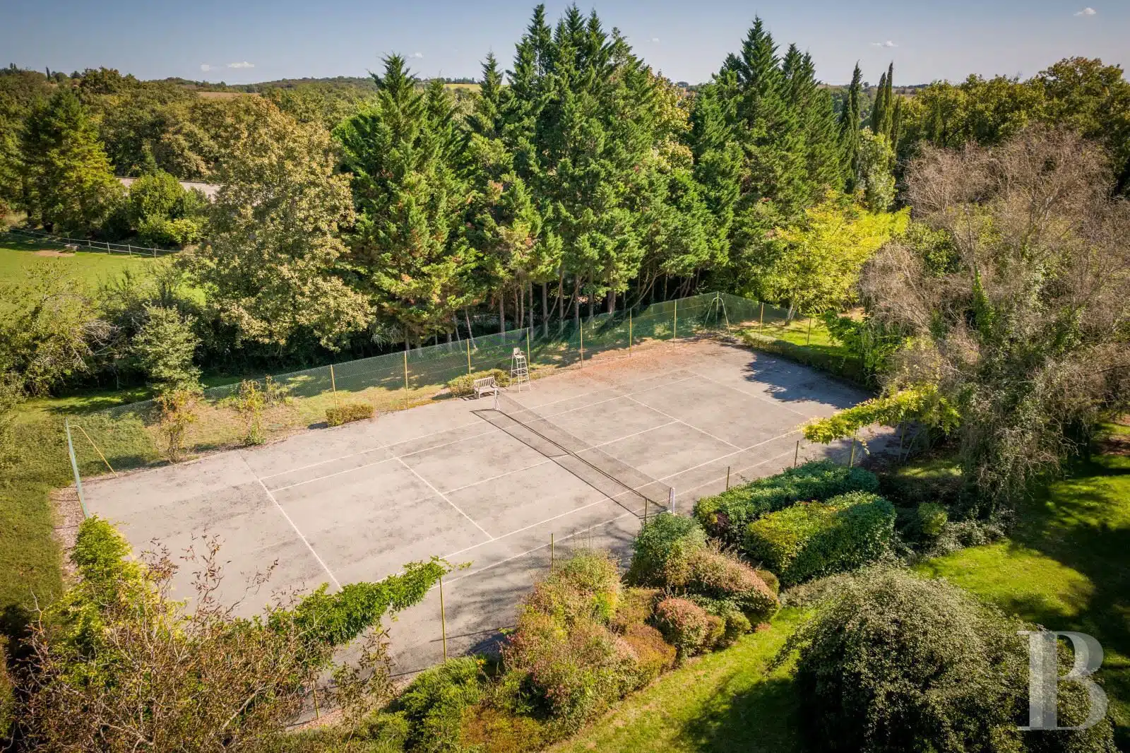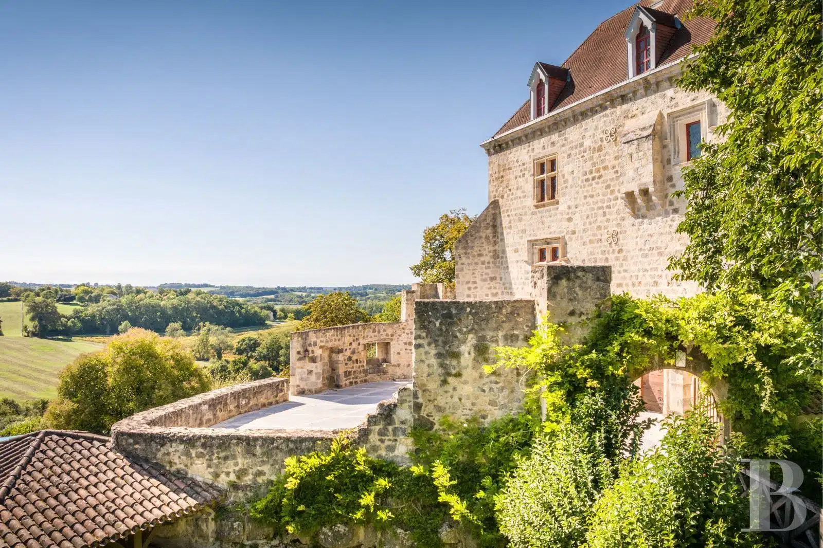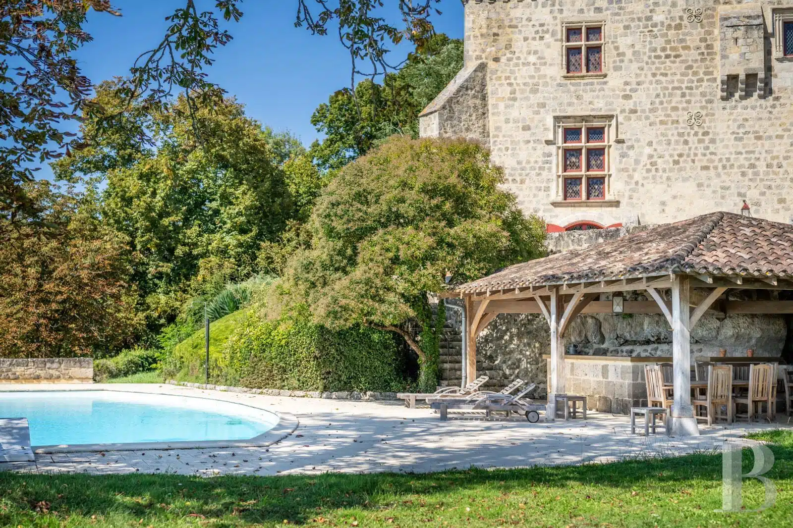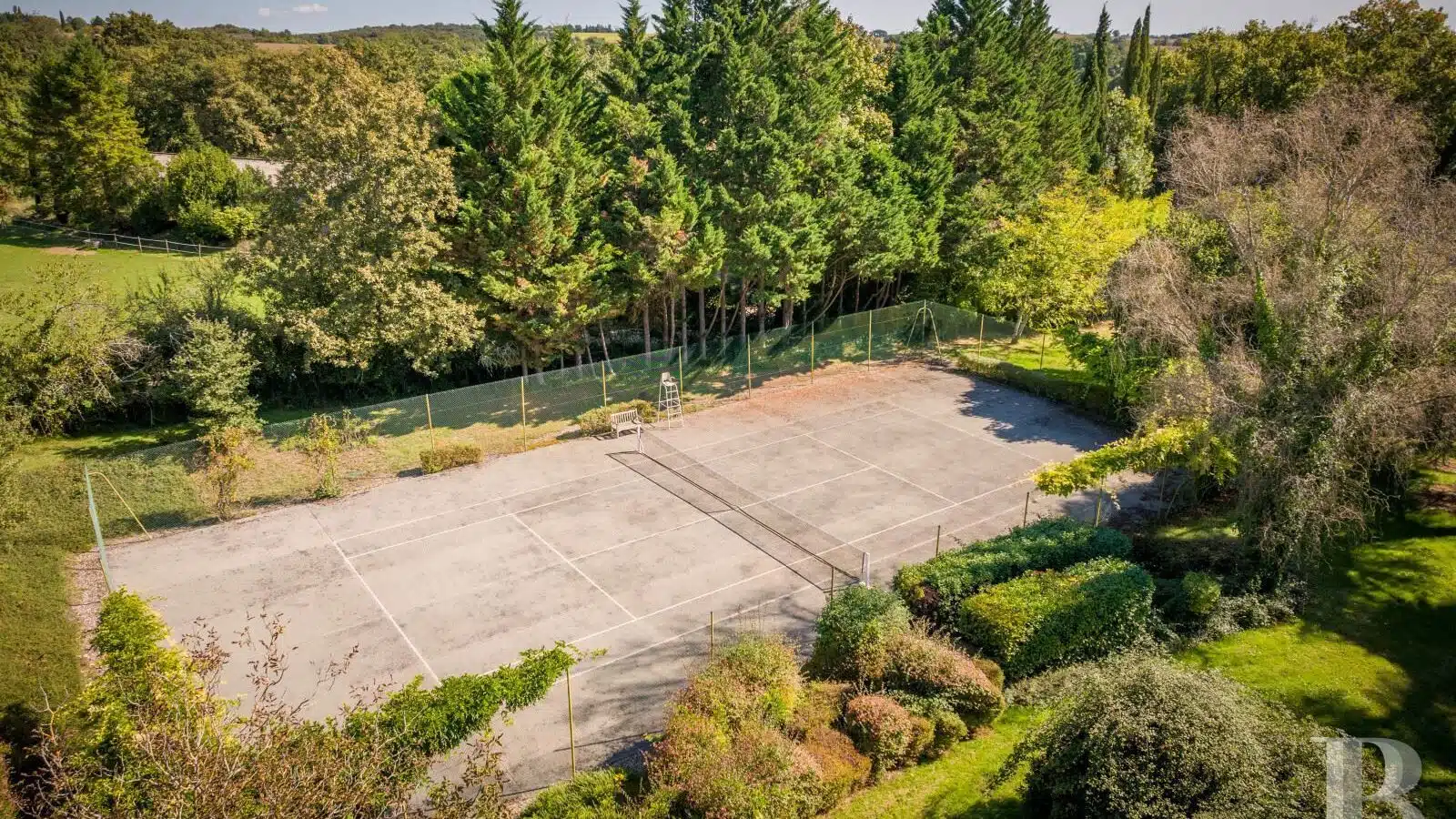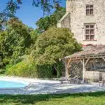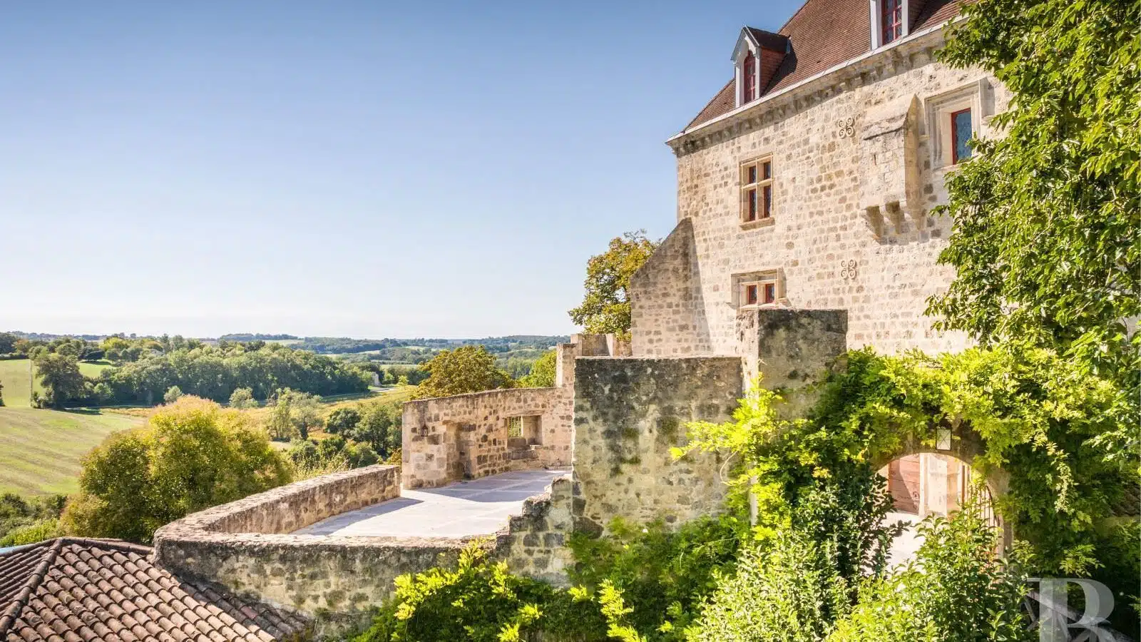 Une paisible route communale permet d'accéder aux deux entrées de la propriété, totalement protégée des regards par des haies fournies. Passé un portail en fer forgé encadré de piliers en pierre, une allée cavalière s'enfonce sous la frondaison d'arbres majestueux plusieurs fois centenaires. De grandes pelouses se déploient jusqu'au terrain de tennis et ses abords paysagers. Après plus de 200 m, une première grande bâtisse, à usage de maison d'amis, composée de deux corps à l'équerre et dont l'allure rappelle celle des chaumières, se dévoile. Sur la droite apparaît alors le château. Élevé de quatre niveaux, coiffé de pavillons couverts de tuiles plates, il est entouré d'une terrasse dallée de pierre et ceinturé de murs ainsi que de douves sèches qu'enjambe l'ancien pont-levis. Il se présente telle la proue d'un navire dominant la campagne vallonnée au sud, offrant une vue jusqu'aux Pyrénées. À une soixantaine de mètres de la première dépendance, une seconde, de type longère, entourée de prés clos, abrite un logement et des écuries. Un hangar à vocation agricole, fermé sur trois pans, complète l'ensemble bâti. Desservie par un chemin d'accès privé qui conduit à la route, cette partie du domaine est séparée des habitations principales par un épais massif végétal. En contrebas du château, à flanc de coteau, une piscine à débordement prend place au sein d'une grande terrasse dallée, agrémentée d'une étonnante cuisine d'été abritée et bâtie contre la roche en sortie de douve. Les terres du domaine s'étendent jusqu'au lac créé en bas du vallon et sur les coteaux.