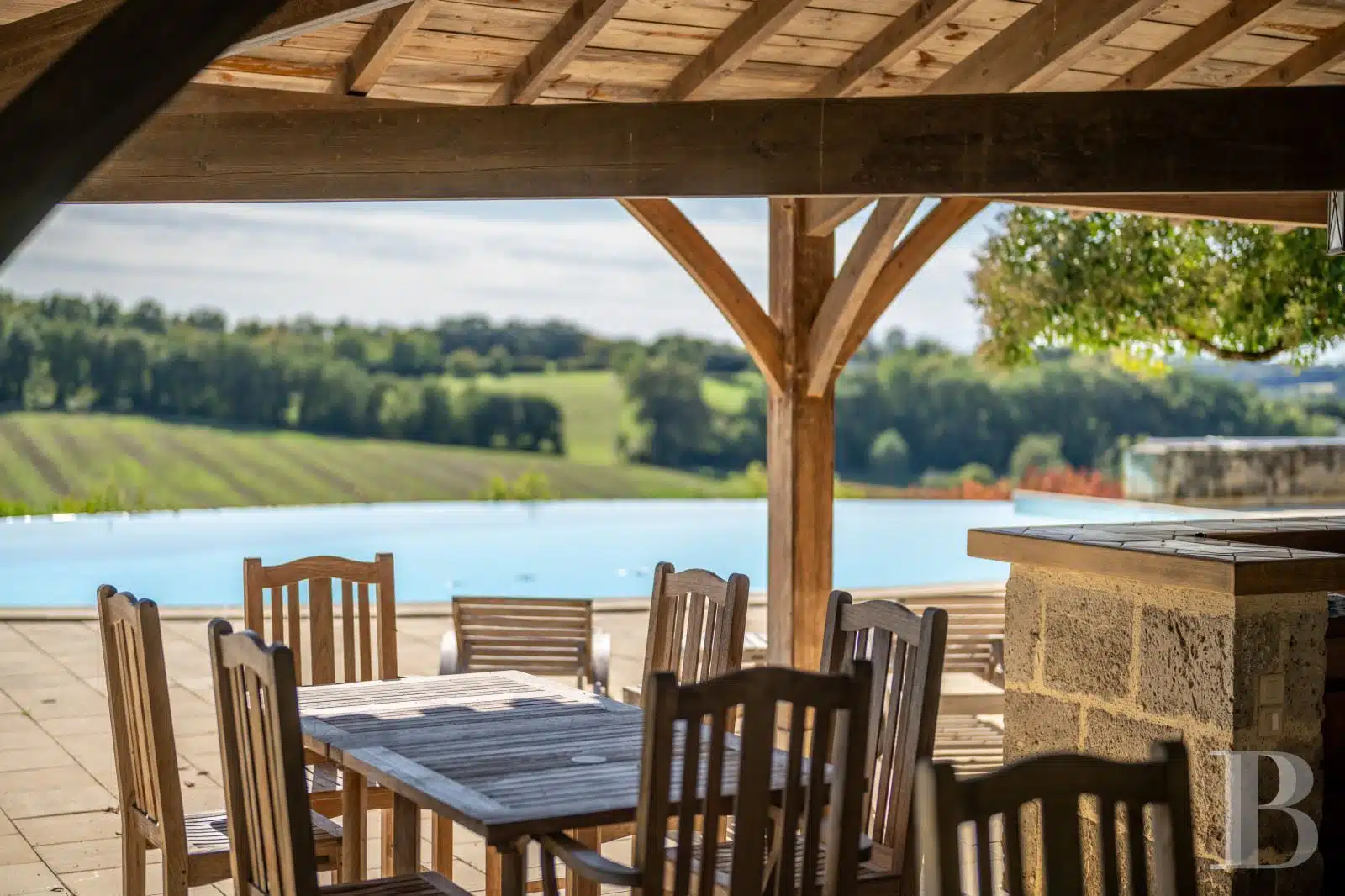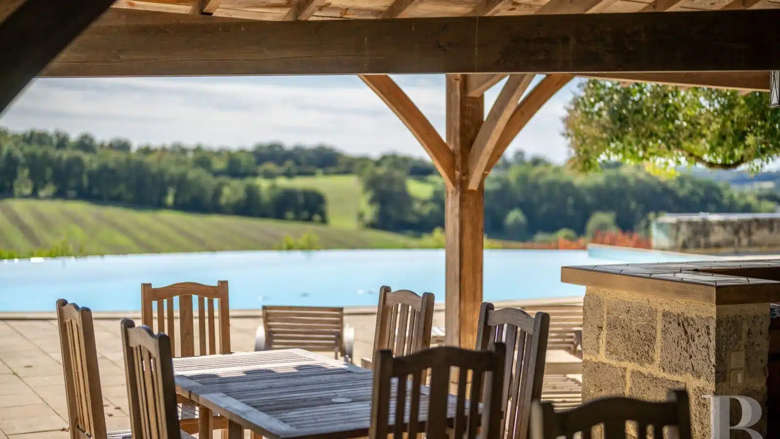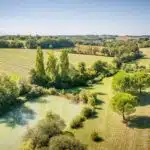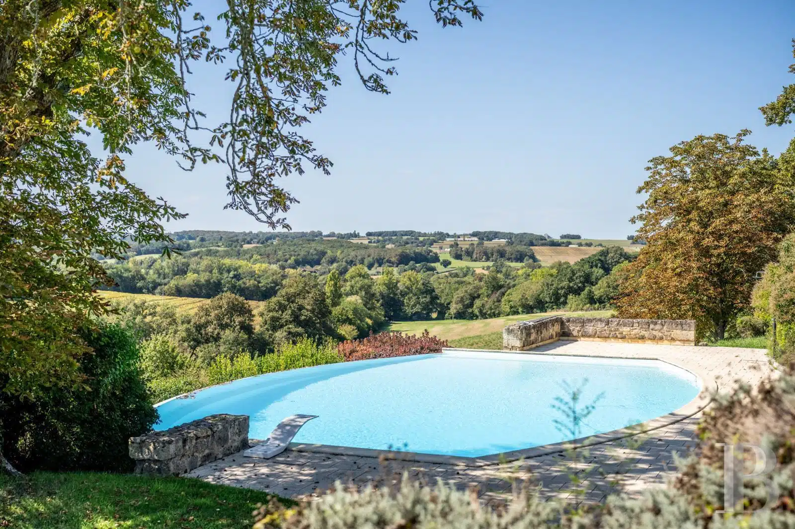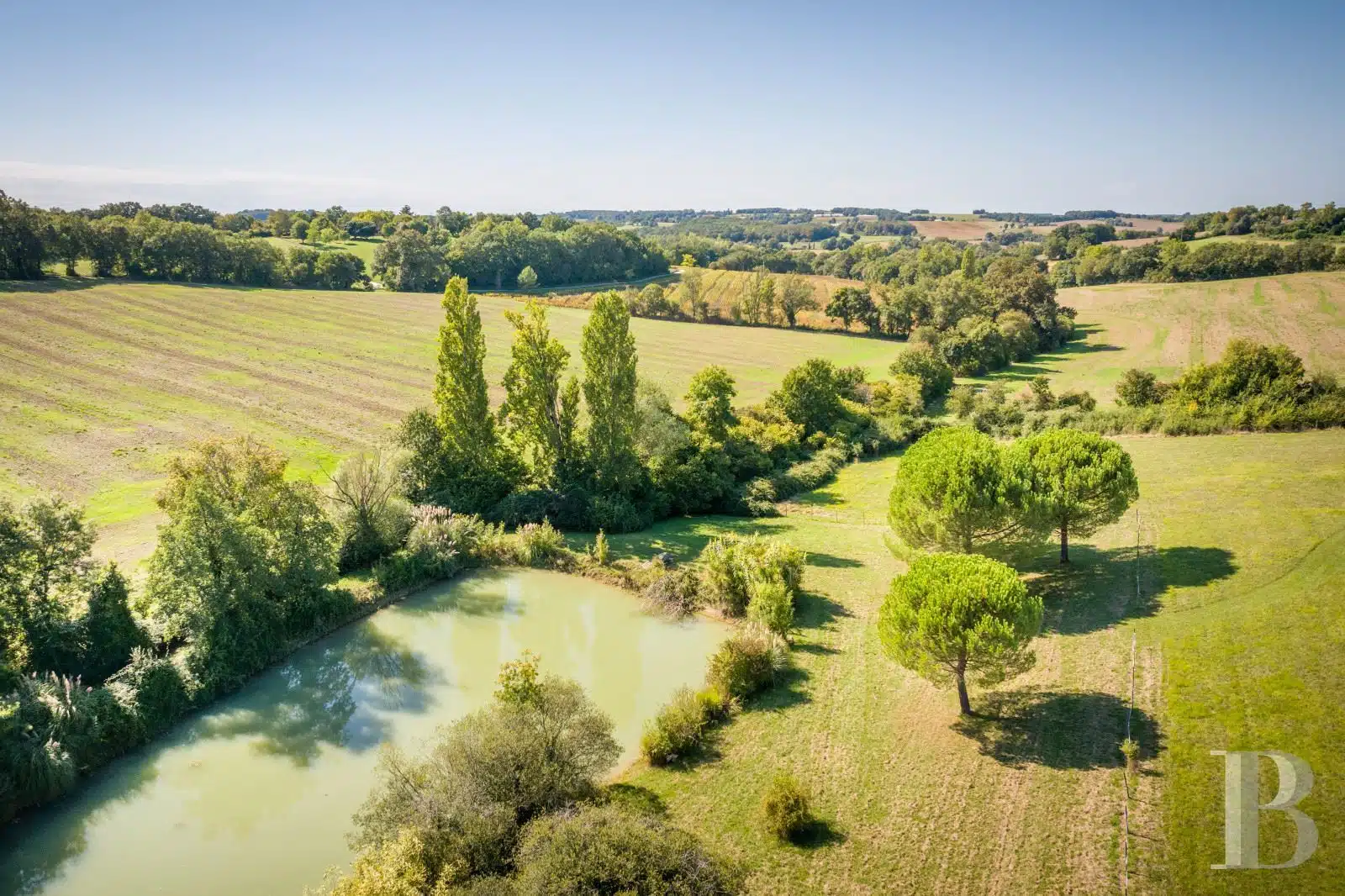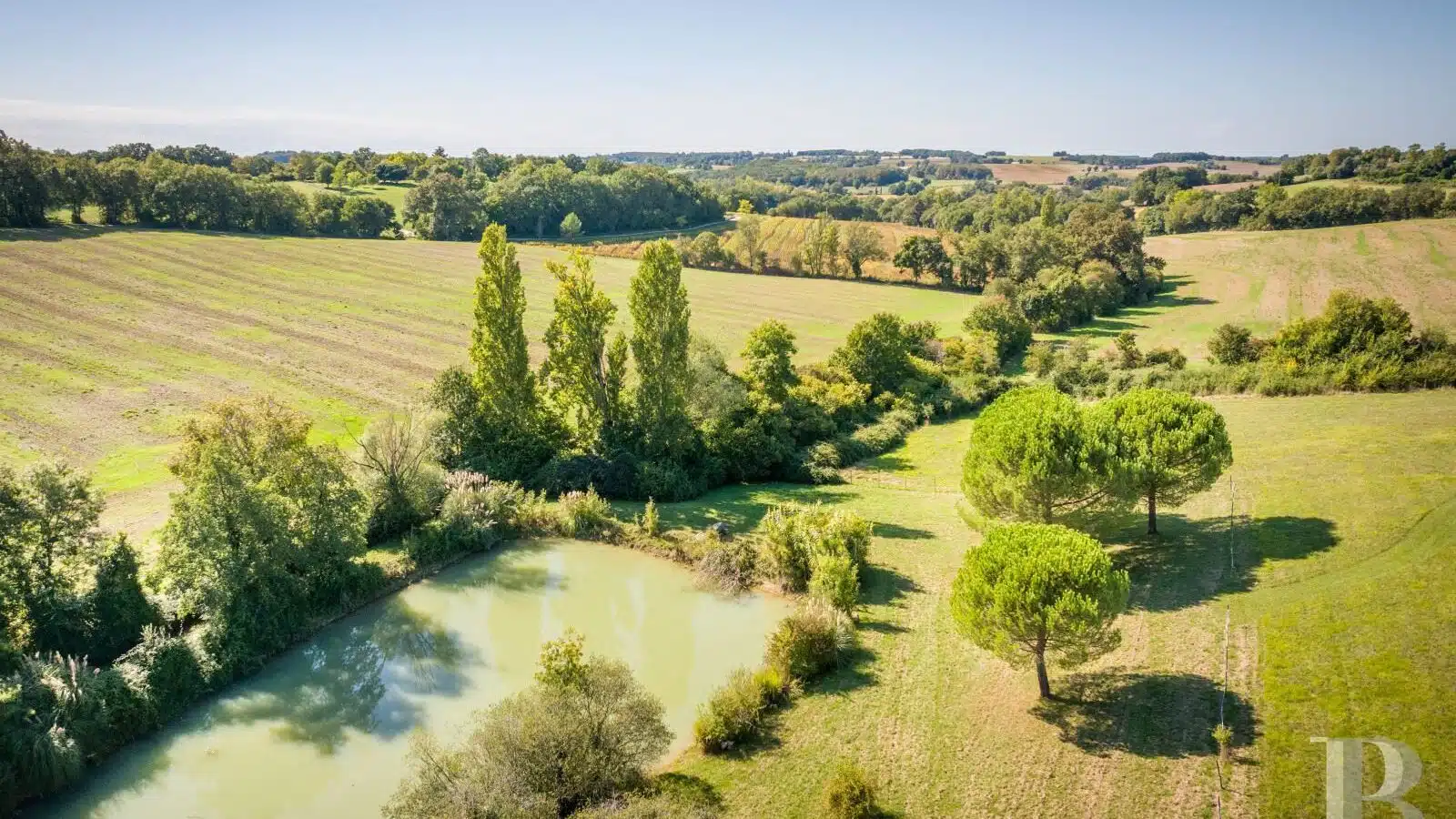 Une paisible route communale permet d'accéder aux deux entrées de la propriété, totalement protégée des regards par des haies fournies. Passé un portail en fer forgé encadré de piliers en pierre, une allée cavalière s'enfonce sous la frondaison d'arbres majestueux plusieurs fois centenaires. De grandes pelouses se déploient jusqu'au terrain de tennis et ses abords paysagers. Après plus de 200 m, une première grande bâtisse, à usage de maison d'amis, composée de deux corps à l'équerre et dont l'allure rappelle celle des chaumières, se dévoile. Sur la droite apparaît alors le château. Élevé de quatre niveaux, coiffé de pavillons couverts de tuiles plates, il est entouré d'une terrasse dallée de pierre et ceinturé de murs ainsi que de douves sèches qu'enjambe l'ancien pont-levis. Il se présente telle la proue d'un navire dominant la campagne vallonnée au sud, offrant une vue jusqu'aux Pyrénées. À une soixantaine de mètres de la première dépendance, une seconde, de type longère, entourée de prés clos, abrite un logement et des écuries. Un hangar à vocation agricole, fermé sur trois pans, complète l'ensemble bâti. Desservie par un chemin d'accès privé qui conduit à la route, cette partie du domaine est séparée des habitations principales par un épais massif végétal. En contrebas du château, à flanc de coteau, une piscine à débordement prend place au sein d'une grande terrasse dallée, agrémentée d'une étonnante cuisine d'été abritée et bâtie contre la roche en sortie de douve. Les terres du domaine s'étendent jusqu'au lac créé en bas du vallon et sur les coteaux.