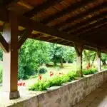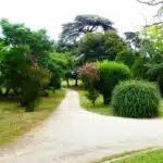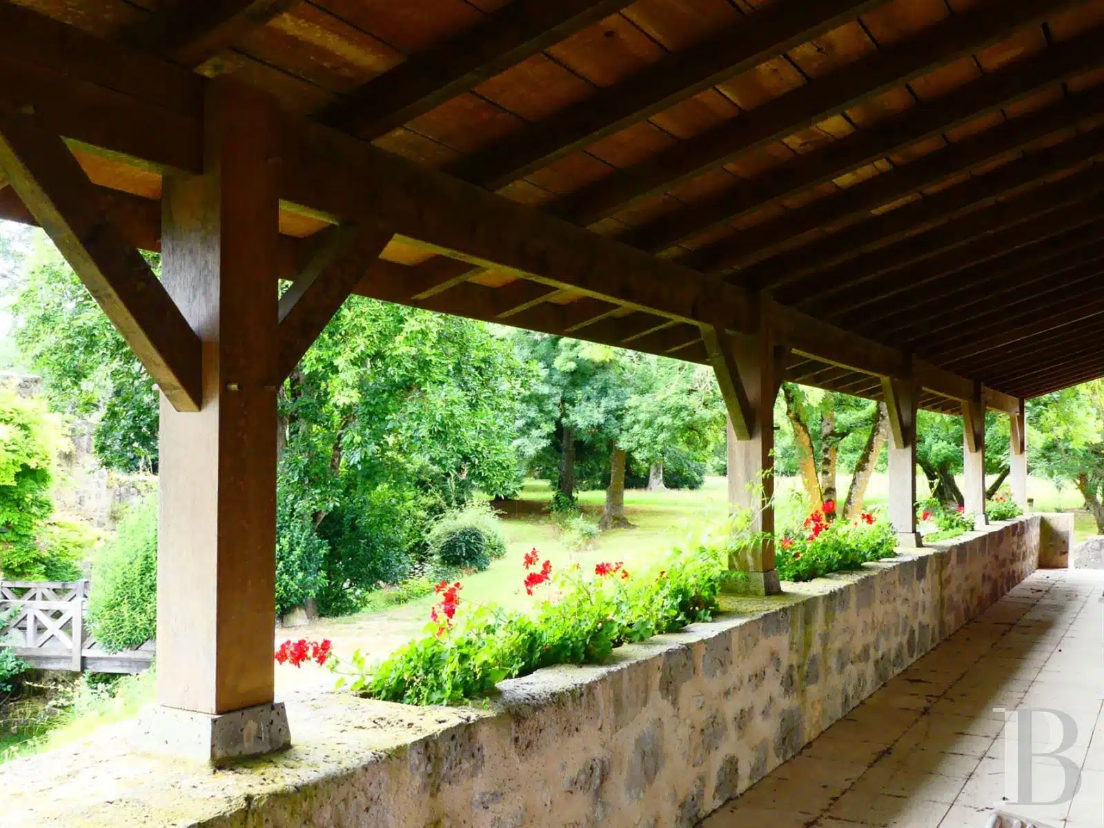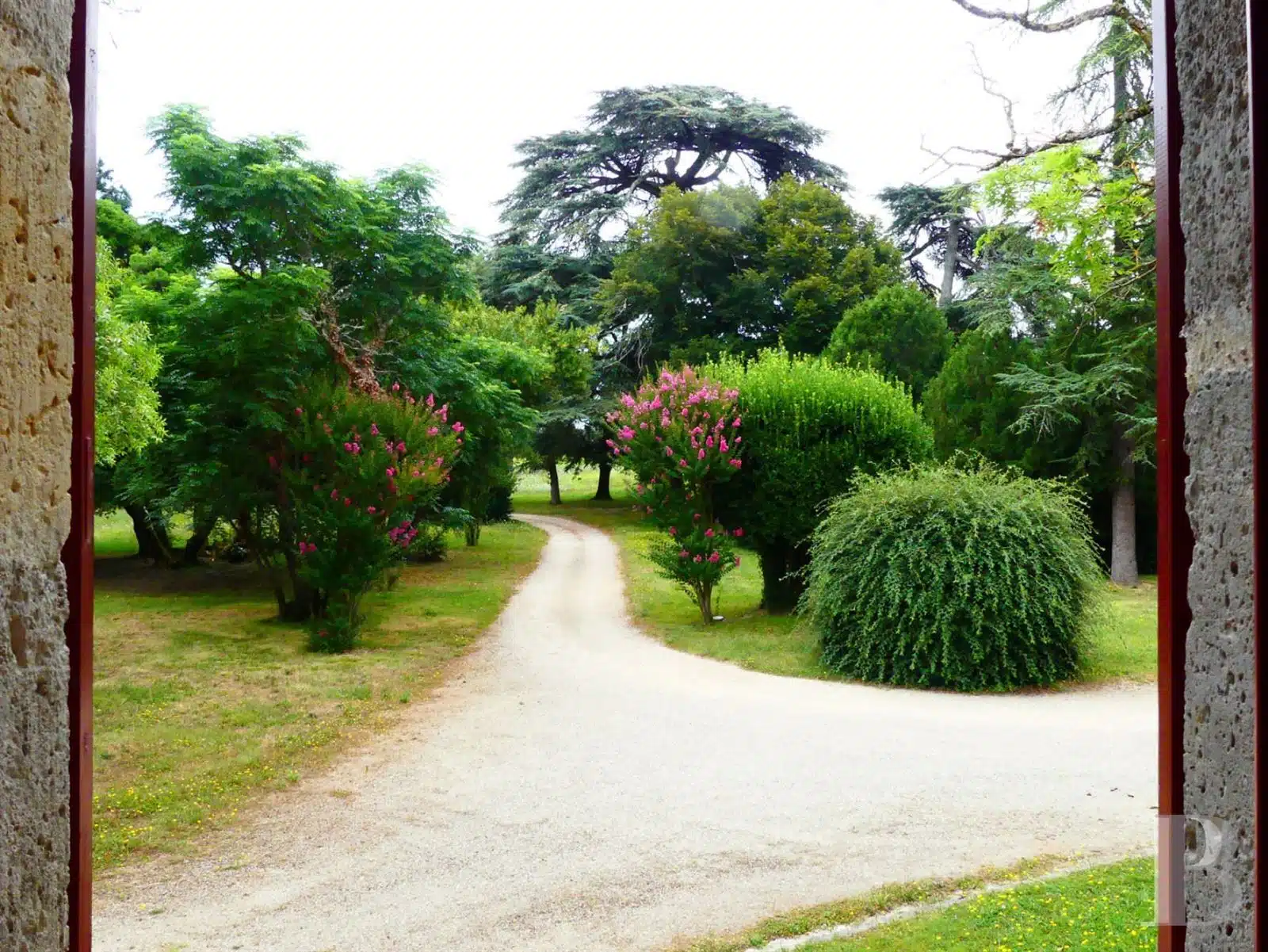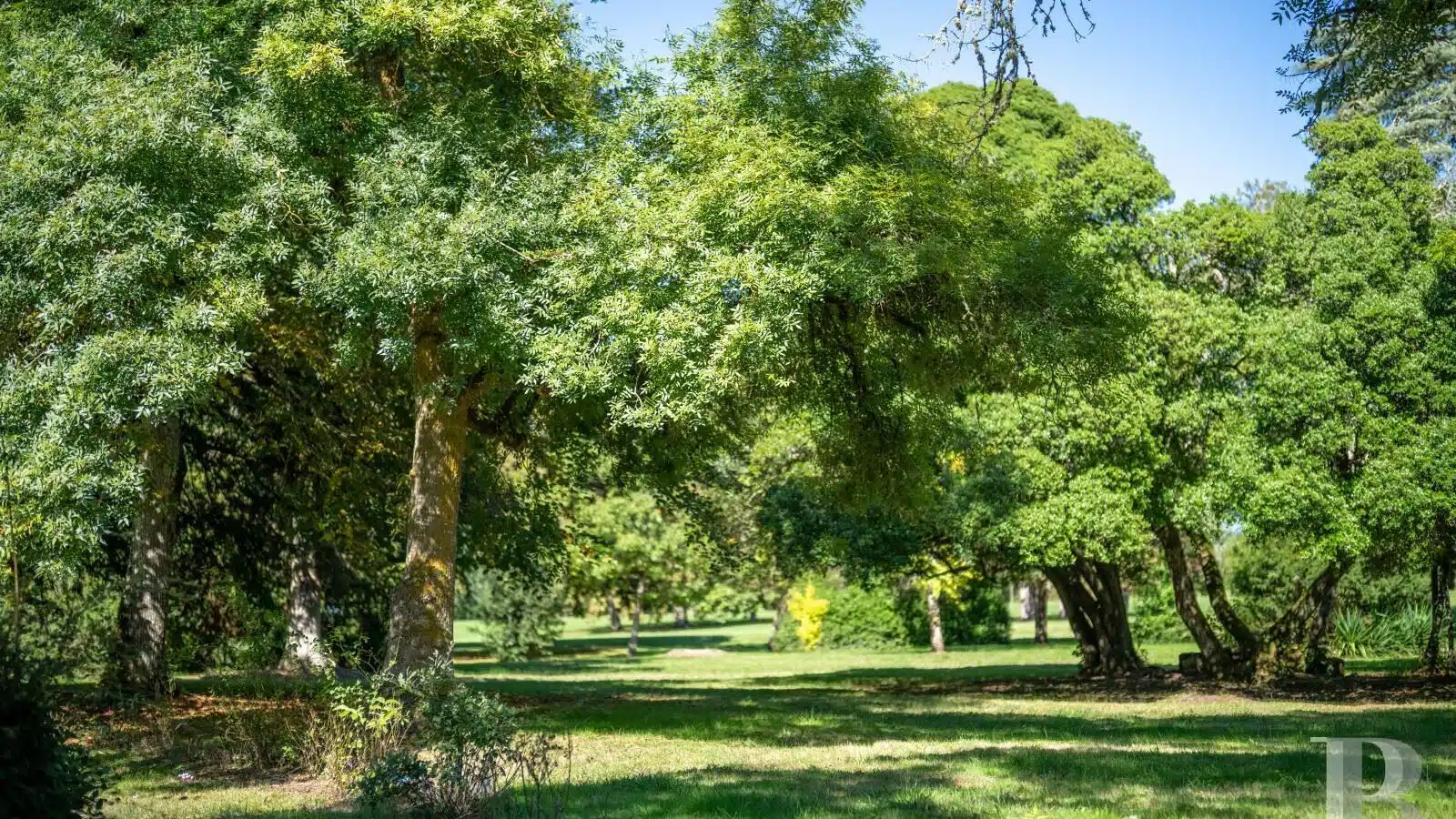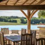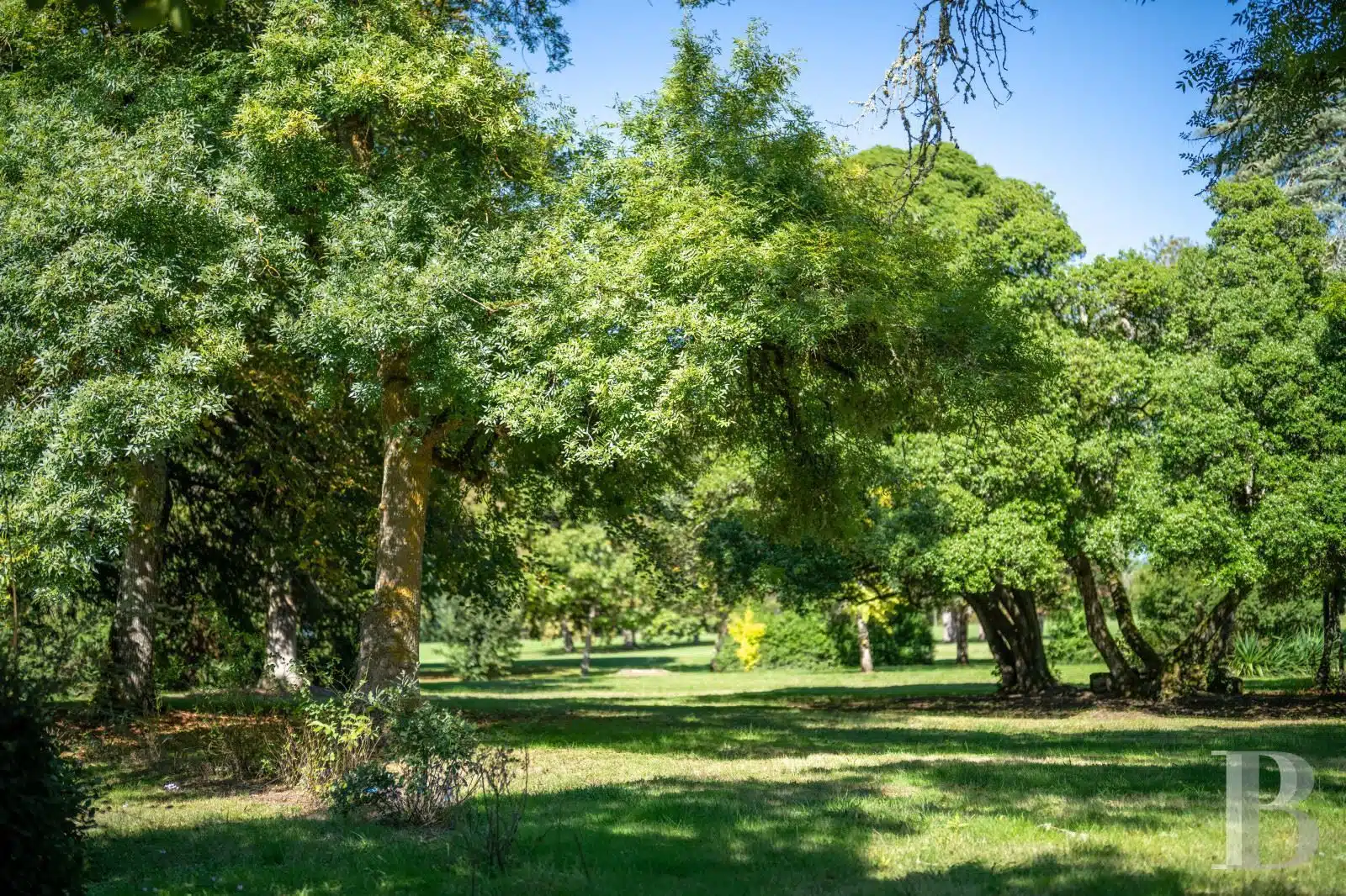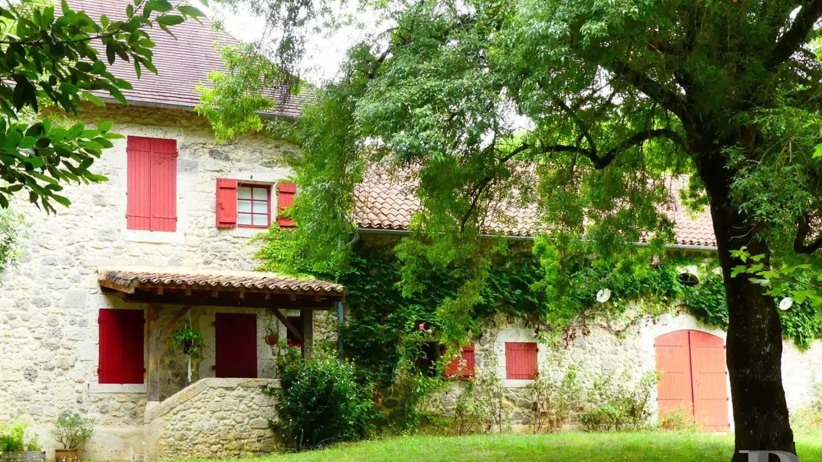 Une paisible route communale permet d'accéder aux deux entrées de la propriété, totalement protégée des regards par des haies fournies. Passé un portail en fer forgé encadré de piliers en pierre, une allée cavalière s'enfonce sous la frondaison d'arbres majestueux plusieurs fois centenaires. De grandes pelouses se déploient jusqu'au terrain de tennis et ses abords paysagers. Après plus de 200 m, une première grande bâtisse, à usage de maison d'amis, composée de deux corps à l'équerre et dont l'allure rappelle celle des chaumières, se dévoile. Sur la droite apparaît alors le château. Élevé de quatre niveaux, coiffé de pavillons couverts de tuiles plates, il est entouré d'une terrasse dallée de pierre et ceinturé de murs ainsi que de douves sèches qu'enjambe l'ancien pont-levis. Il se présente telle la proue d'un navire dominant la campagne vallonnée au sud, offrant une vue jusqu'aux Pyrénées. À une soixantaine de mètres de la première dépendance, une seconde, de type longère, entourée de prés clos, abrite un logement et des écuries. Un hangar à vocation agricole, fermé sur trois pans, complète l'ensemble bâti. Desservie par un chemin d'accès privé qui conduit à la route, cette partie du domaine est séparée des habitations principales par un épais massif végétal. En contrebas du château, à flanc de coteau, une piscine à débordement prend place au sein d'une grande terrasse dallée, agrémentée d'une étonnante cuisine d'été abritée et bâtie contre la roche en sortie de douve. Les terres du domaine s'étendent jusqu'au lac créé en bas du vallon et sur les coteaux.