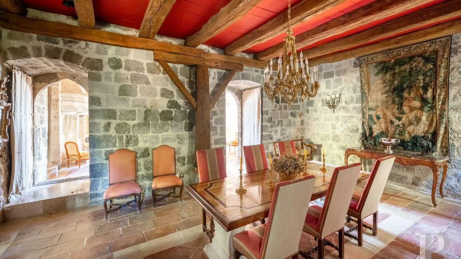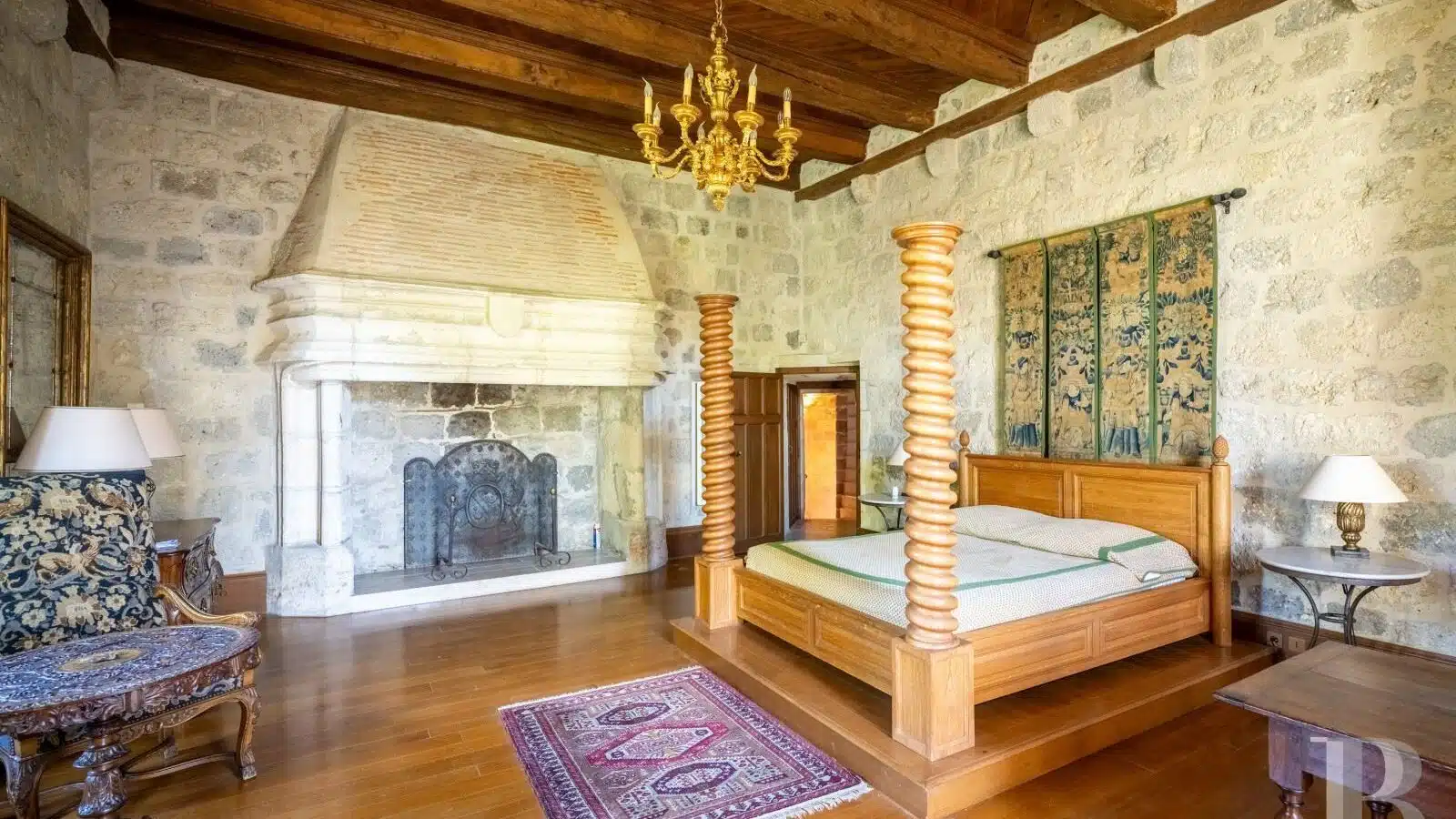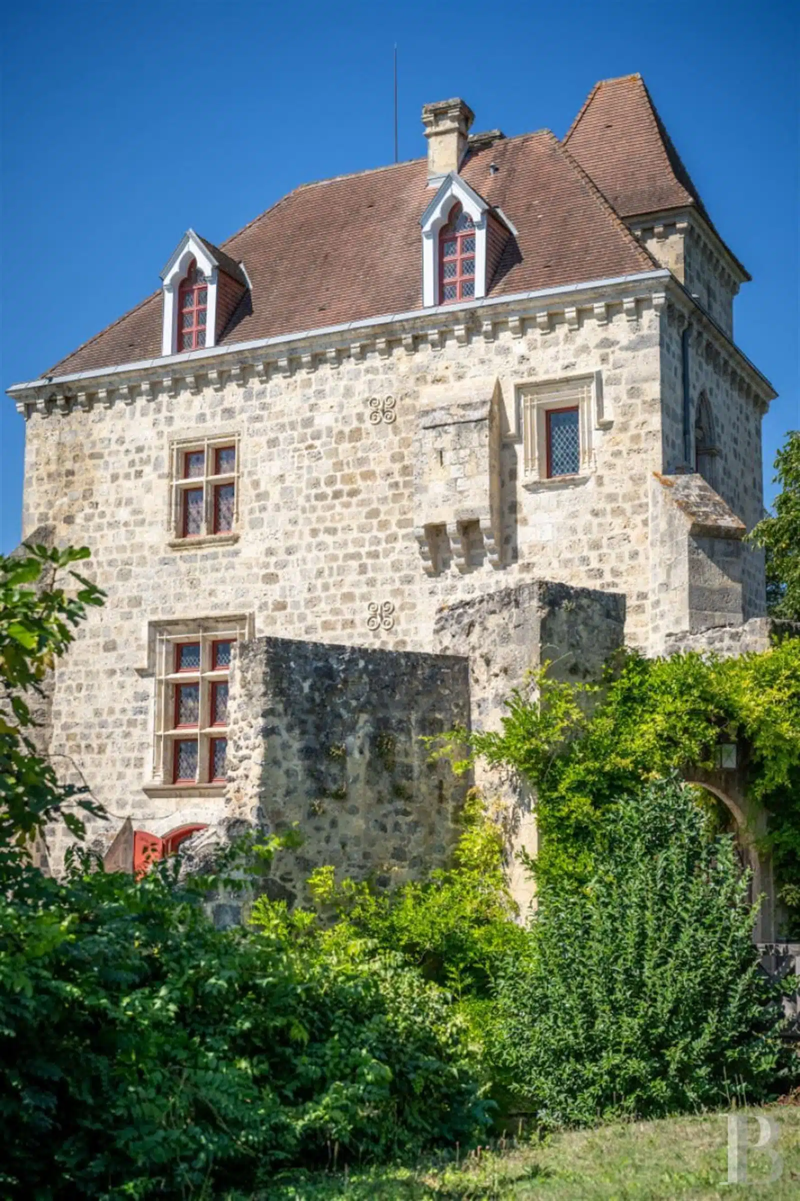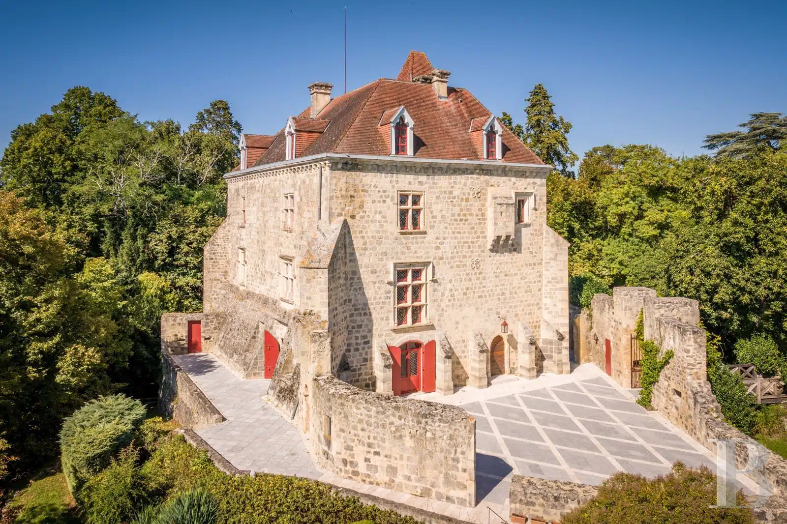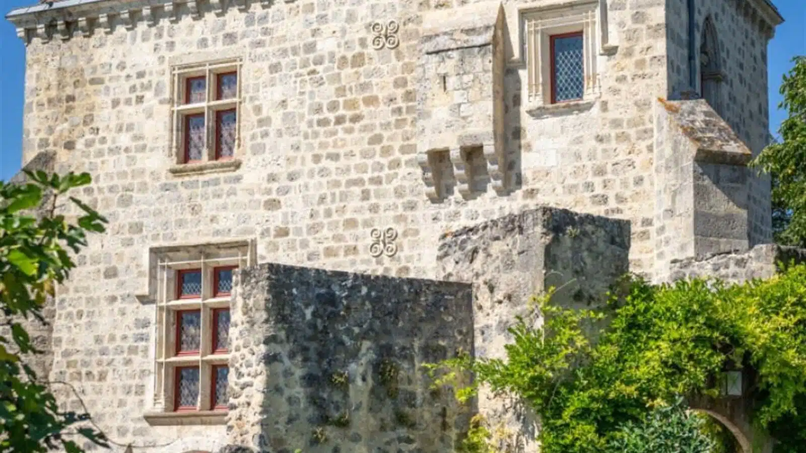 À 1 h 30 de Bordeaux, à 10 min d'une cité royale, un château médiéval restauré, avec trois logements indépendants, dans un parc de 30 ha avec écuries, piscine et tennis.